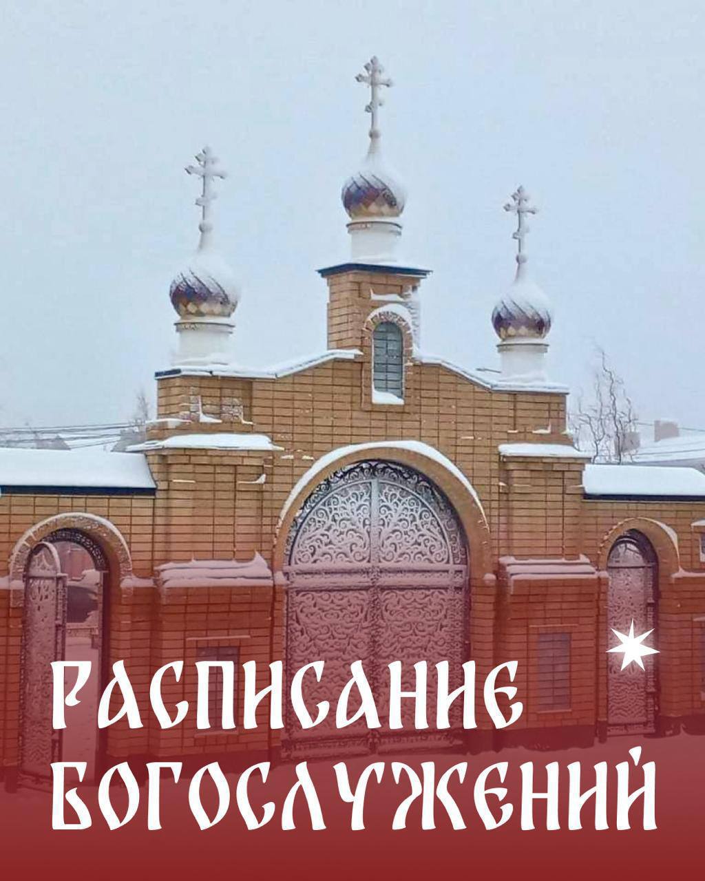 Расписание Богослужений на неделю 6 января, вторник: 16:00 — Великое Повечерие и Утреня; 7 января, среда: Рождество Христово 00:00 — Литургия; 10 января, суббота: 08:00 — исповедь, Литургия; 16:00 — вечернее Богослужение, исповедь; 11 января, воскресенье: 08:30 — исповедь, Литургия;