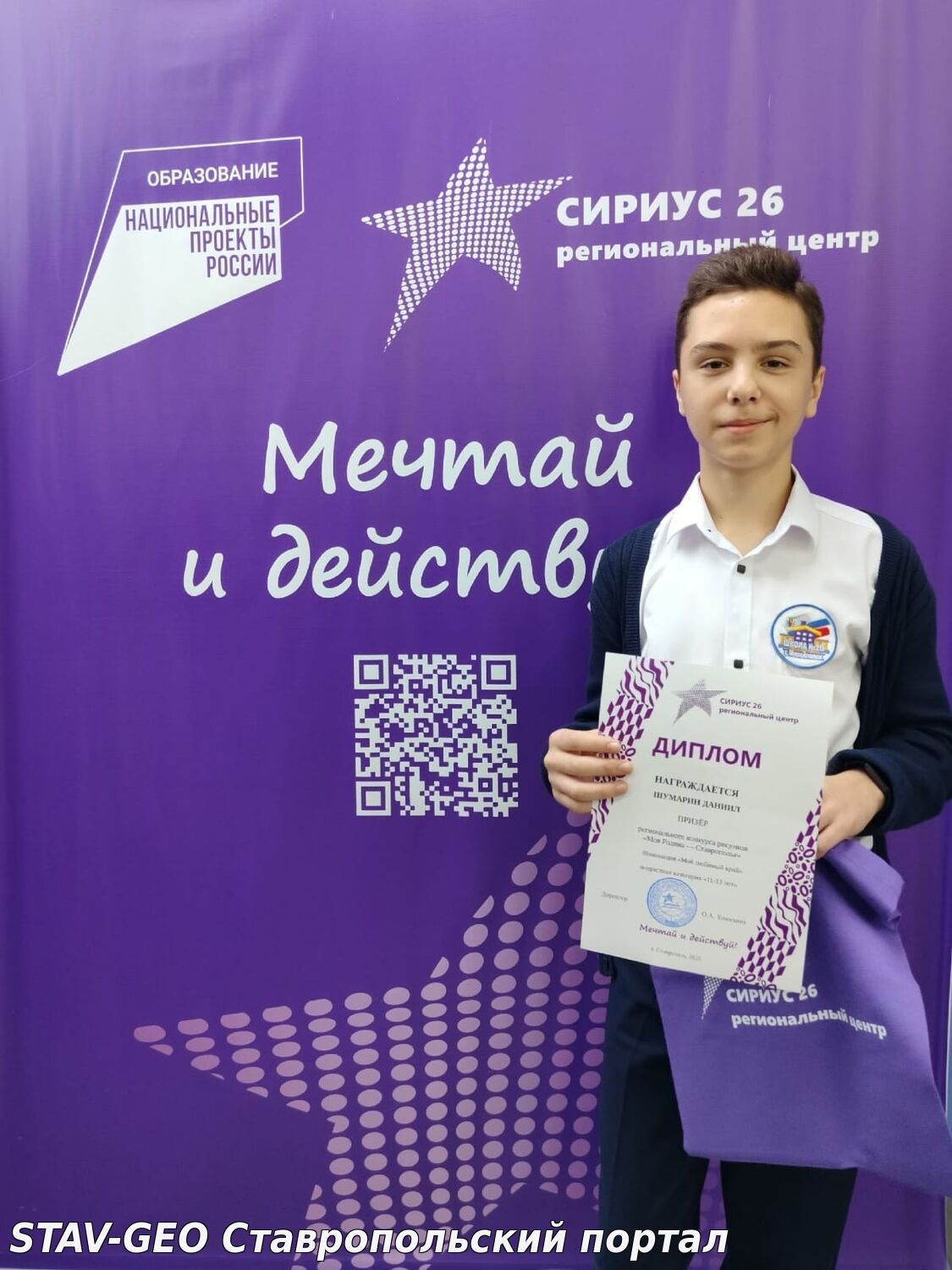 В рамках проведения мероприятий, посвященных Дню Ставропольского края, ученик 7 "Д" класса МБОУ СОШ N20 Шумарин Даниил стал призером регионального конкурса рисунков "Моя Родина - Ставрополье" в номинации "Мой любимый край" с работой "Беспутские поляны", на региональной платформе Сириус 26.