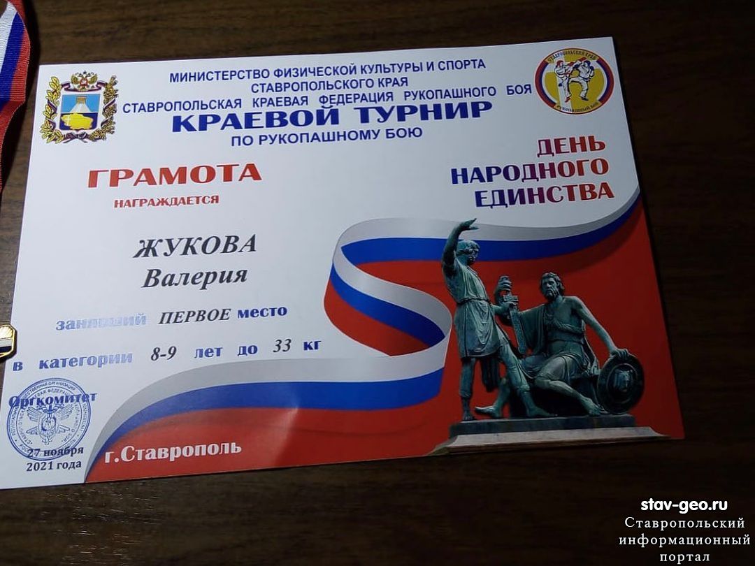 Жукова Валерия ученица 3"И" заняла первое место в краевом турнире Ставропольского края по рукопашному бою