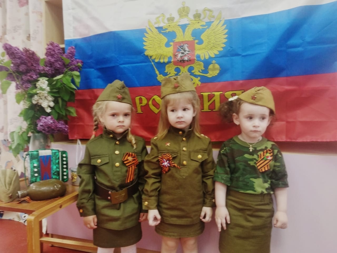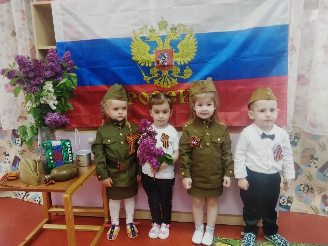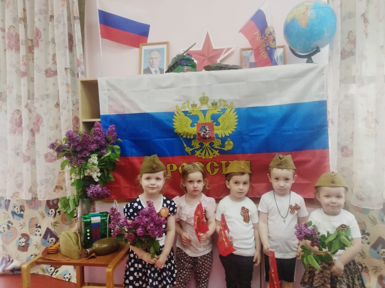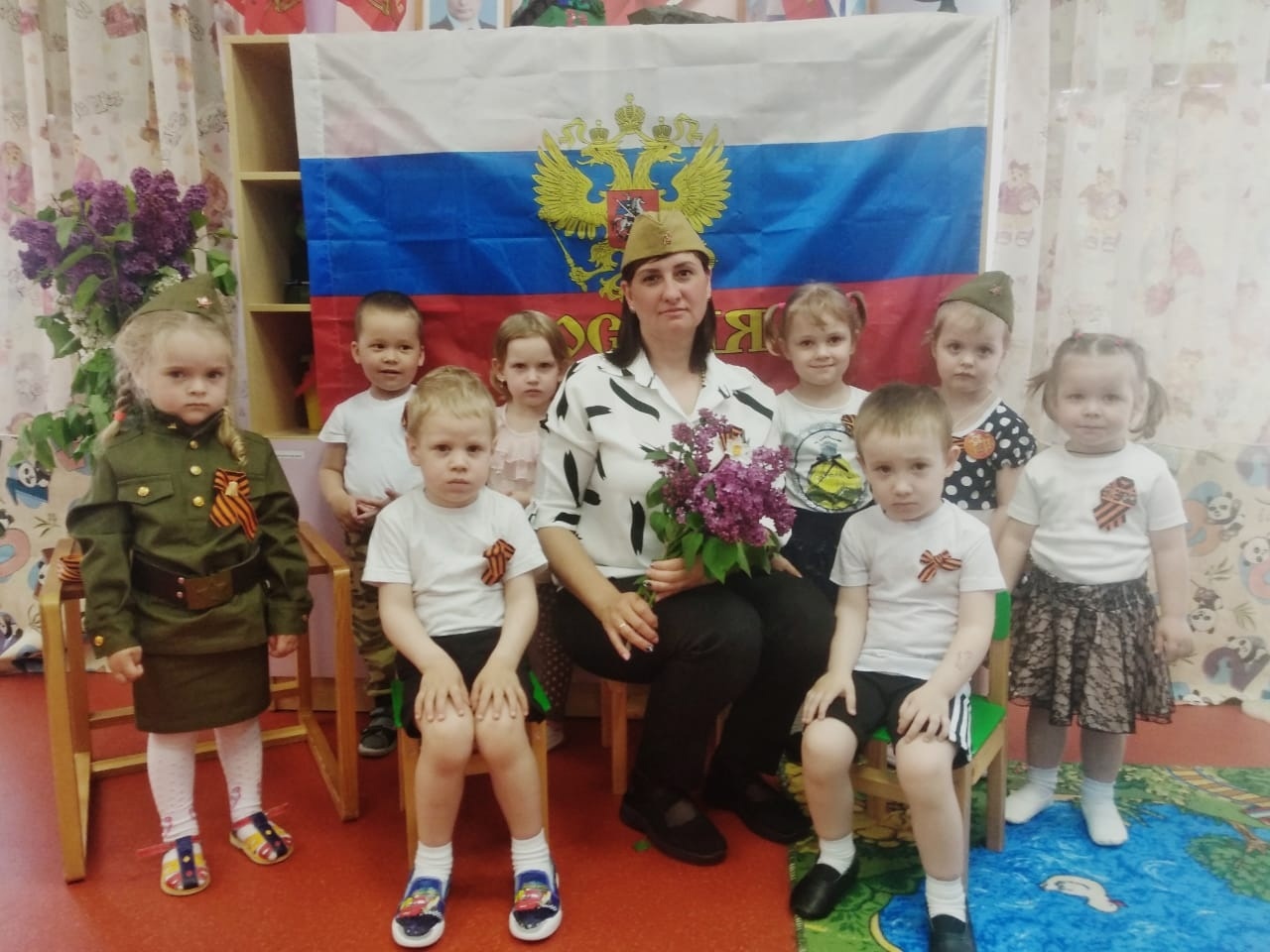 В первой младшей группе № 2 прошла беседа, посвященная мужественным и суровым дням Великой Отечественной войны. Воспитанники узнали, что 9 мая наша страна отмечает большой праздник, что война - это зло, а мир- это счастье и радость. В конце беседы педагоги с ребятами прикрепили георгиевские ленточки в память о наших погибших солдатах. Следующий