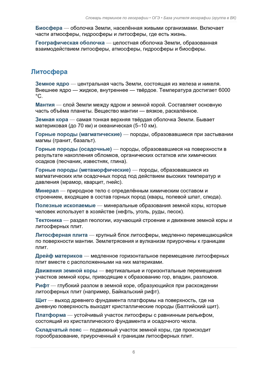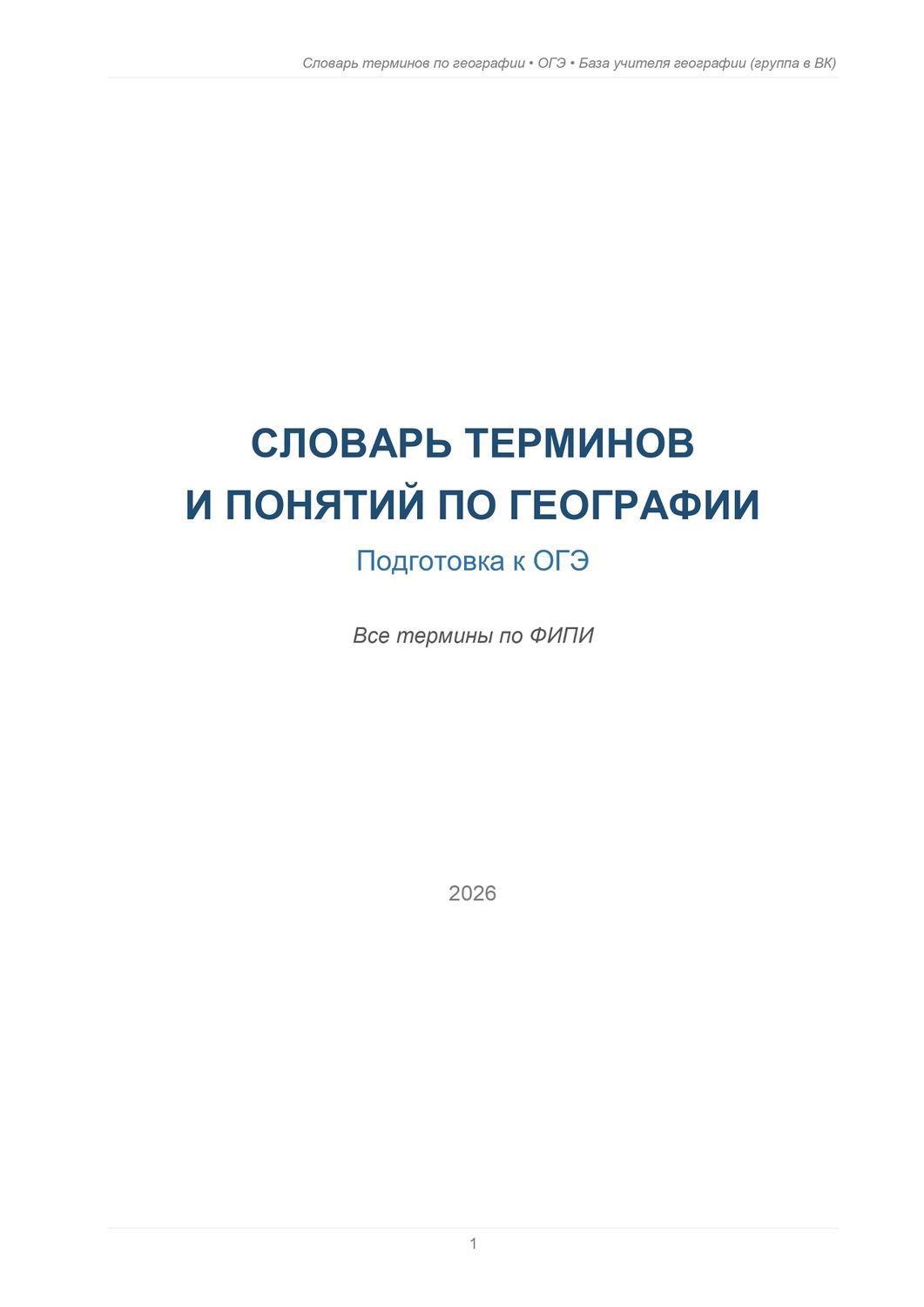 Образовательная задача — собрать в одном документе полный перечень терминов по географии, рекомендованных ФИПИ, и оформить их понятным языком. Этот материал рассчитан на тему “География Земли” от литосферы до биосферы, на раздел “Взаимодействие природы и общества” с акцентом на ресурсы, экологию и стихийные явления, а также на раздел “География России” — территория, население и хозяйство. Структура документа — в файле будут три ключевые части, соответствующие разделам ФИПИ. Каждый термин объясняется простыми словами, но с сохранением научной точности. Учить легко, запоминать — ещё легче. Что внутри — как заявлено, разделы охватывают: • География Земли — концепции от литосферы до биосферы и их взаимосвязи; • Взаимодействие природы и общества — ресурсы, экология, стихийные явления и их влияние на человека; • География России — территория, население и хозяйство, региональные особенности и примеры. Как использовать — документ подходит для повторения перед ОГЭ, самостоятельной подготовки и быстрого освежения памяти. Каждый термин подано ясно, с примерами и минимальной теоретической нагрузкой, чтобы запоминать легче. Преимущества для учащихся — компактный формат, единый стиль объяснений, отсутствуют лишние детали, есть заострение на практическом применении знаний и запоминании ключевых понятий. Дополнительно планируется встроить интерактивные элементы: краткие тесты, карточки и примеры задач для закрепления. Следите за обновлениями — полная версия будет доступна в одном файле после финальной редакции. | |
