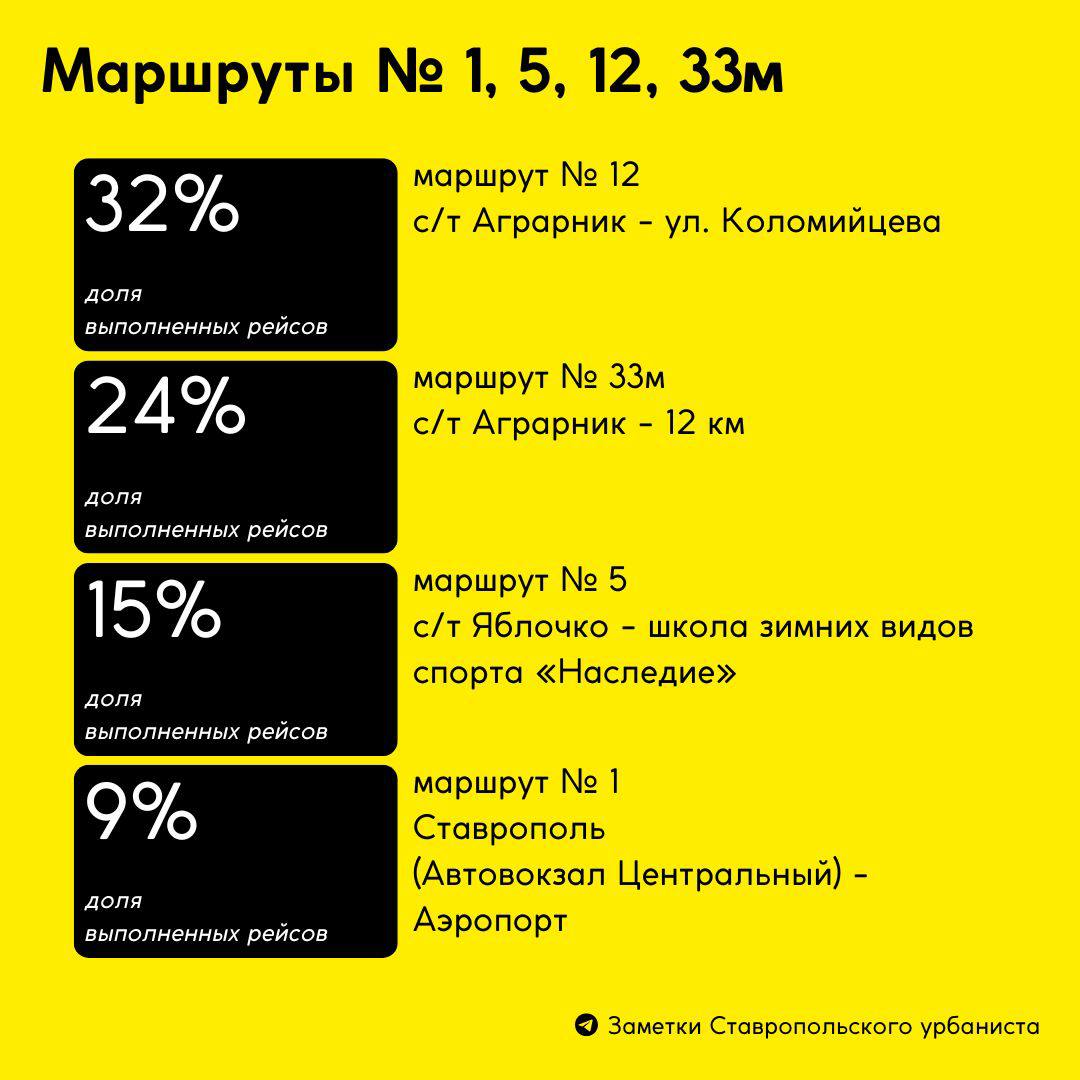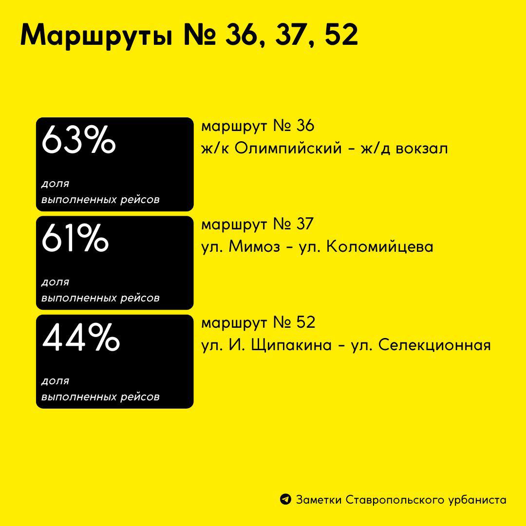 Худший маршрут по выполнению рейсов - № 1 (в аэропорт) с 9% выполненных рейсов, лучший - маршрут № 36, который выполнил 63% рейсов.