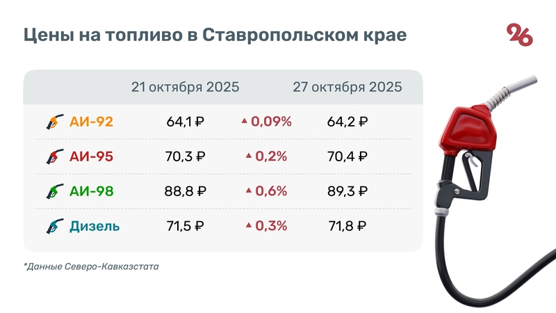 Цена бензина АИ-95 в Ставропольском крае, по данным Северо-Кавказстата, поднялась до 70,4 руб/л. Насколько подорожало топливо в регионе за неделю — в инфографике «Победы26». Поделиться в: Следующий