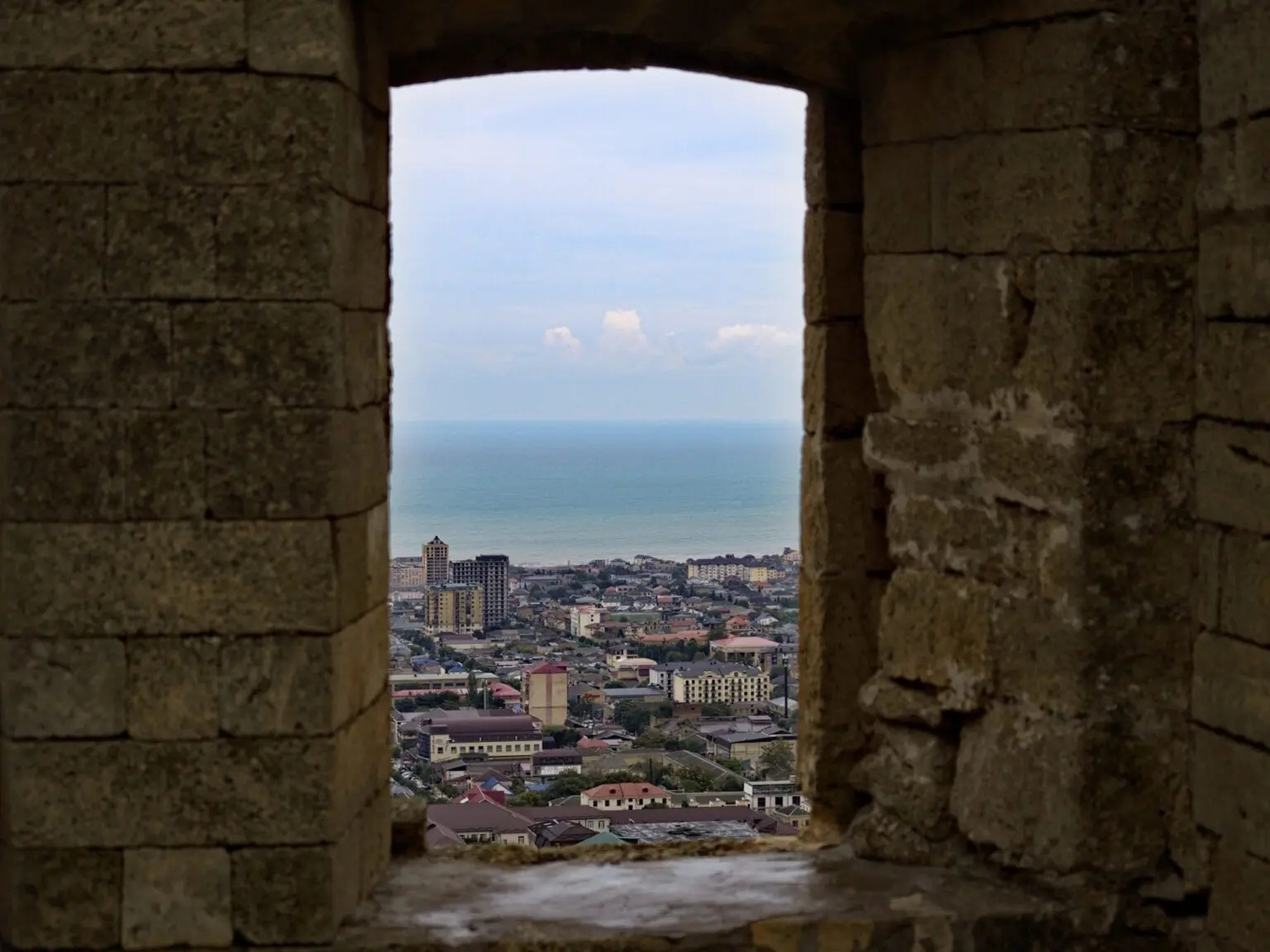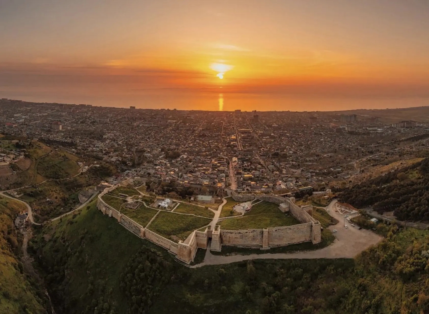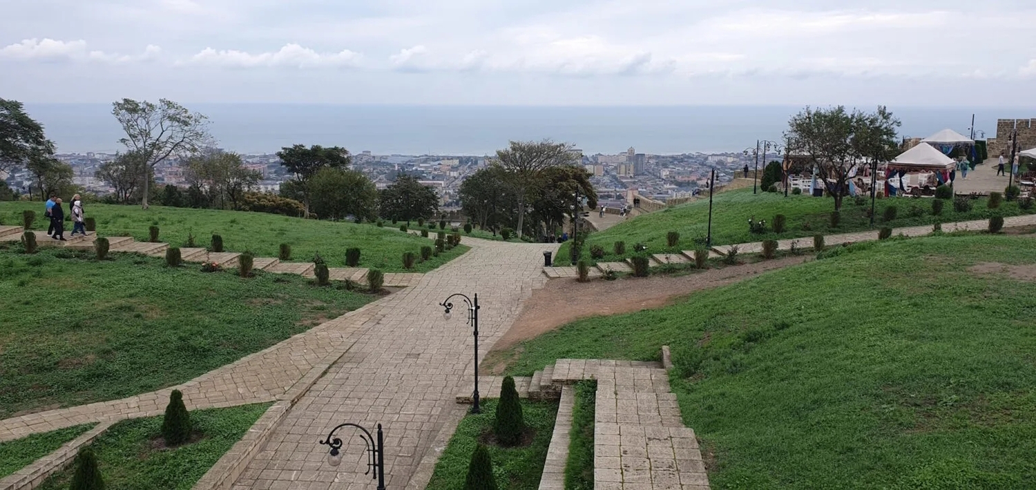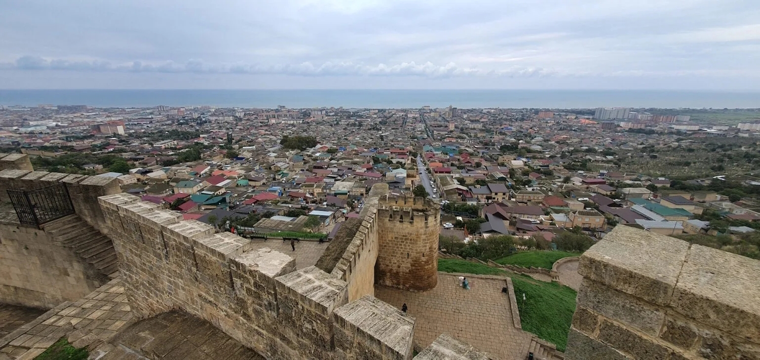Сверху открывается панорама на старый Дербент и Каспий. В ясную погоду видно, как город буквально «стекает» к морю между древними стенами.