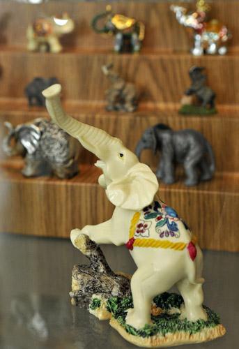 Вместе с Анной Константиновной мы любуемся фигурками, расставленными за стеклом. Каждая не просто сувенир, а со своим смыслом и назначением. Вот подсвечники, брелки, магнитики, подставки для карандаша и телефона, есть слон-щеточка, есть слоник, изображающий буддийского божка. Материалы для их изготовления применены самые разные, тут соседствуют слоны из кости, яшмы, гранита, сердолика, бирюзы, нефрита, оникса, стекла, керамики. Вон какие нарядные выстроились красавцы, сразу видно – это индийские. Там, как известно, к этим животным особенно почтительное отношение. Рядом с калмыковским великолепием разместились фигурки, собранные самим музеем: работы гжельских мастеров не спутаешь ни с чьими благодаря знаменитой синей росписи, как и прибалтийских, украсивших слонов попонами, богато усыпанными теплым янтарем.