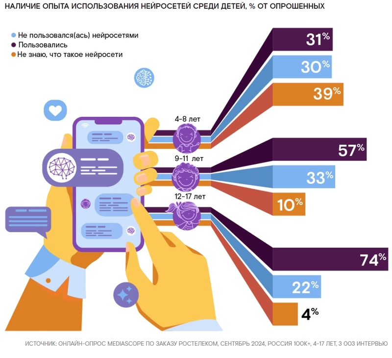 Исследование состояло из двух частей. Первая, вышедшая в 2024 году, была посвящена медиапотреблению: как дети общаются, учатся и творят в Интернете. Вторая часть, представленная в 2025 году, сфокусирована уже на цифровых рисках. Согласно отчёту, от 54% до 80% детей в зависимости от возраста уже сталкивались с различными онлайн-угрозами. Частота инцидентов растёт вместе со взрослением ребенка. Несмотря на риски, большинство детей демонстрируют понимание основ цифровой гигиены. Они стараются не общаться с незнакомцами, не оставлять личные данные, скрывать местоположение и не скачивать подозрительные файлы. Эксперты подчёркивают: понимание привычек детей и подростков важно для бизнеса и разработчиков, так как в ближайшем будущем именно это поколение станет ключевой аудиторией потребителей.Фото: компания «Ростелеком»Также поколение «Альфа» активно осваивает новые технологии. К концу 2024 года более половины детей использовали нейросети, а свыше 80% регулярно общаются с голосовыми помощниками. Младшие дети делают это даже активнее подростков, так как росли в окружении умных колонок. Половина школьников уже имеет банковские карты, что открывает новый пласт финансовых рисков. Для бизнеса это сигнал: будущие сервисы должны быть интуитивными, персонализированными и мультимодальными, с бесшовной интеграцией голосовых интерфейсов, которые станут основным способом взаимодействия с цифровым миром. Поделиться в: Следующий