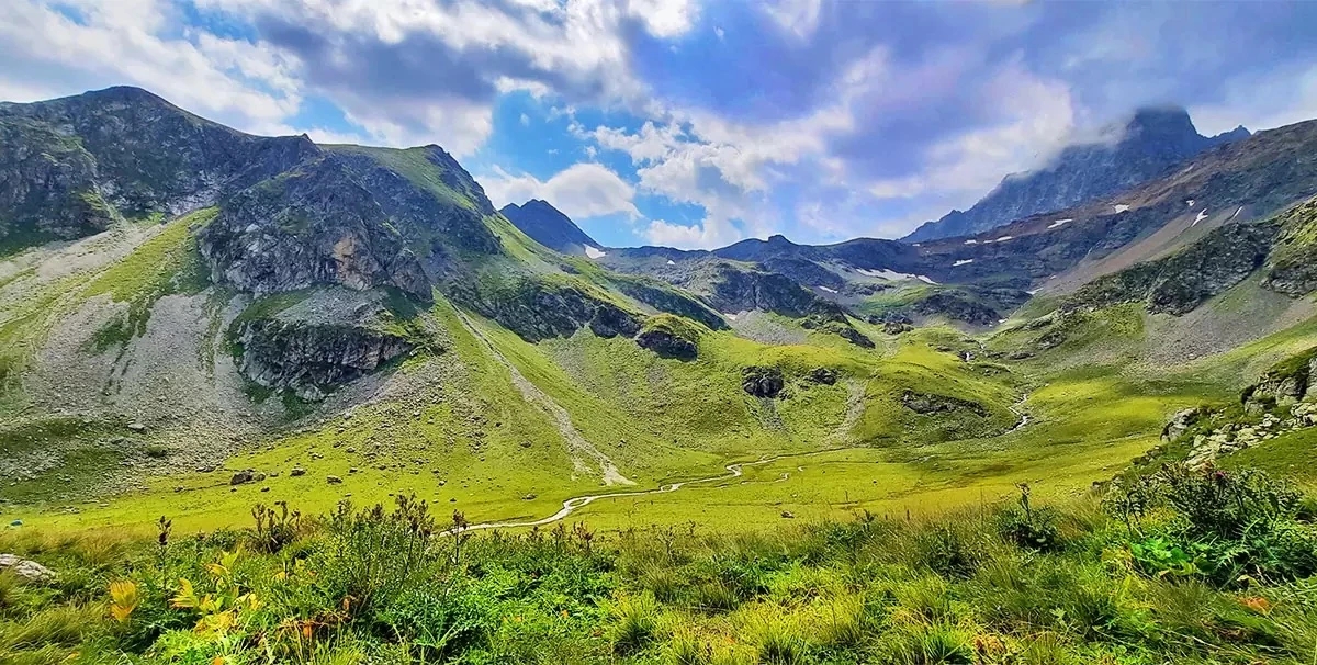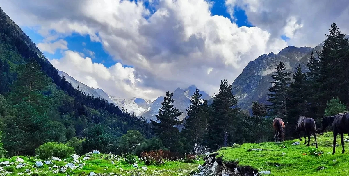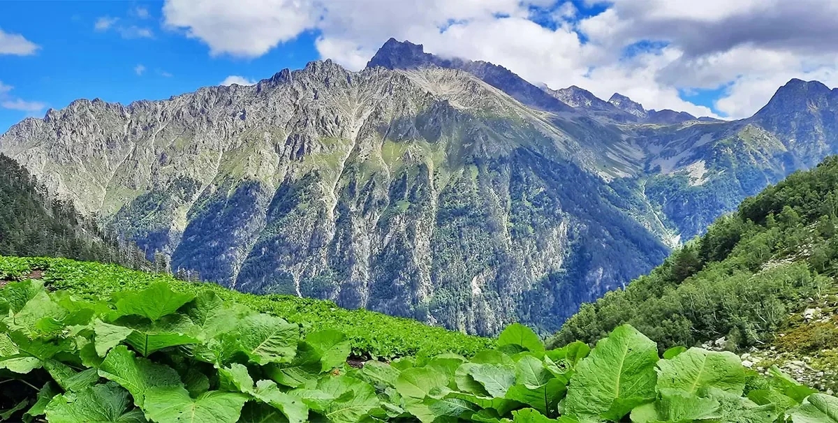 Долина Аксаута — один из самых диких и недооцененных уголков Кавказа. Здесь нет толп туристов и привычной инфраструктуры — только горы, река и ощущение полной оторванности от мира. Река Аксаут, название которой переводят как «белая вода», берет начало от ледников и тянется почти на 80 км. Она пробивает себе путь через хребты, ущелья и леса, меняя характер от спокойных участков до бурных порогов. Само ущелье постоянно меняется: то узкие каменные «коридоры», где река зажата скалами, то широкие долины с альпийскими лугами и пасущимися лошадьми. В ясную погоду вокруг открываются виды на вершины Мысты-Баши, Марка-Баши и гору Аксаут. Что важно знать: Сезон: июнь–октябрь Дорога: после Хасаут-Греческого — грунтовка, лучше брать у местных внедорожник Магазины только до въезда в долину Стоимость: бесплатно