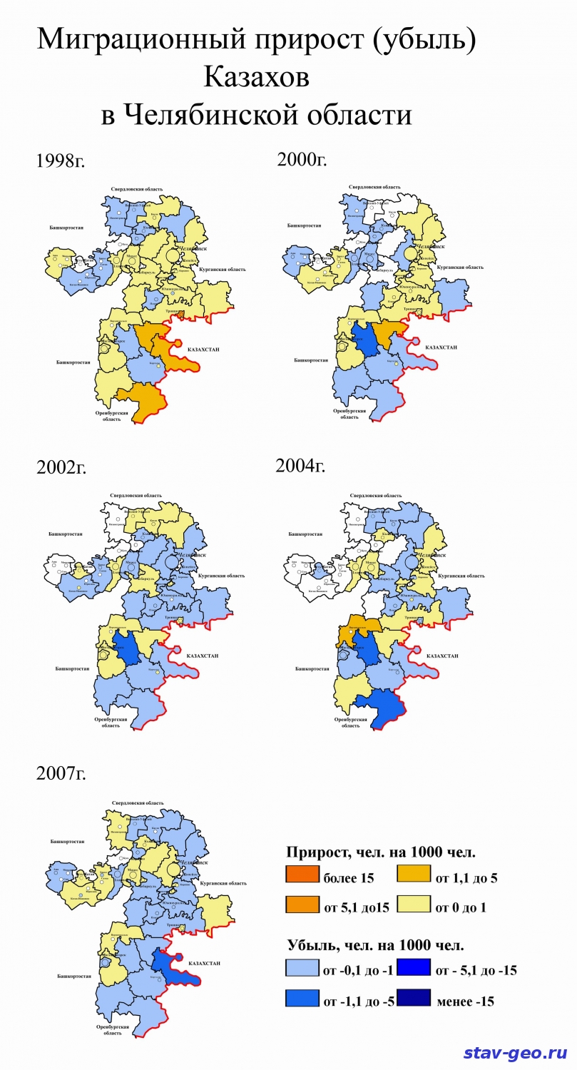 В Челябинскую область в 1998г. прибыло 1482 чел. казахской национальности, выбыло 999 чел, прирост составил 483 чел. (3% от всех эмигрантов). Из них 95% (460 чел.) прибыло из Республики Казахстан. Среди регионов выделились приграничные районы восточной части области находящиеся по соседству с Костанайской областью Республики Казахстан. Наибольший коэффициент миграционного прироста наблюдался в Варненском (2,0‰), Бреденском (1,7‰) и Чесменском (2,5‰) районах, г.Троицк (6,2‰). Убыль ровна приросту в Кусинском, Катав-Ивановском районах и г. Чебаркуль, г.Копейск, г.Усть-Катав. Агаповский (0,5‰), Троицкий, Октябрьский, Увельский по (0,4‰), Верхнеуральский (0,7‰), Кизильский, Еткульский (0,2‰), г.Челябинск (0,04). Незначительный коэффициент миграционной убыли в районах северной части области: Катав-Ивановский (-0,8‰), Саткинский (-0,03‰), г.Еманжелинск (-0,03‰). Если в 1998г. только в двух районах коэффициент равнялся нулю, то уже в 2000г. таких районов уже семь, расположены они в горнозаводском промышленном районе области. Однако общий коэффициент миграционного прироста лиц казахской национальности в целом по области вырос до 3,6‰, 99% выходцы из Республики Казахстан. Количество районов с коэффициентом прироста сократилось до десяти из 27. Самый высокий прирост наблюдался в Чесменском приграничном районе с Костанайской областью (1,3‰). А самая высокая убыль в Нагайбакском районе (-1,7‰). В г.Троицке в 20 раз коэффициент уменьшился, до 0,3‰, в областном центре г.Челябинске коэффициент прироста остался прежний. Такая же ситуация и в приграничном Карталинском районе. Прирост увеличился в г.Магнитогорске на 0,1‰, в Южноуральске на 0,2‰. Карталы на 0,5‰. В Верхнеуральском, Увельском, Троицком районах на 0,1‰. Среди приграничных районов убыль в Октябрьском районе (-0,3‰), в Варненском (-0,1‰), Кизильском (-0,5‰), Бреденский (-0,5‰). Тенденция к сокращению прироста эмигрантов казахской нации медленно продолжается и в 2007г. . Вновь за год в целом по области коэффициент сократился на 0,1‰. Прирост наблюдался только в трех районах на севере области. Вся восточная часть границ области имела убыль, кроме Чесменского района, в среднем до (-1,0‰). Только в одном районе Нагайбакском был высокий коэффициент убыли (-1,3‰). Впервые г. Челябинск зафиксировал убыль данной нации (-0,02‰). В г. Карталы (0,6‰), г. Троицк (0,5‰). В Еманжелинске 0,2‰, выросло на 0,2‰. Среди приграничных районов по данным переписи 2002г. казахи компактно проживали в Чесменском, Бреденском, Карталинском районах. В 2004г. ситуация несколько изменилась. На карте области появился район высокого коэффициента миграционного прироста казахов, это Верхнеуральский (1,3‰). В двух приграничных районах (Чесменском и Троицком) наблюдался не значительный прирост (на 0,1‰), в Кизильском районе на 0,6‰. В северо-западной части области в большинстве районах коэффициент равнялся нулю. Наивысшая убыль в Нагайбакском районе (-1,9‰) и приграничном Бреденском (-1,5‰). | |