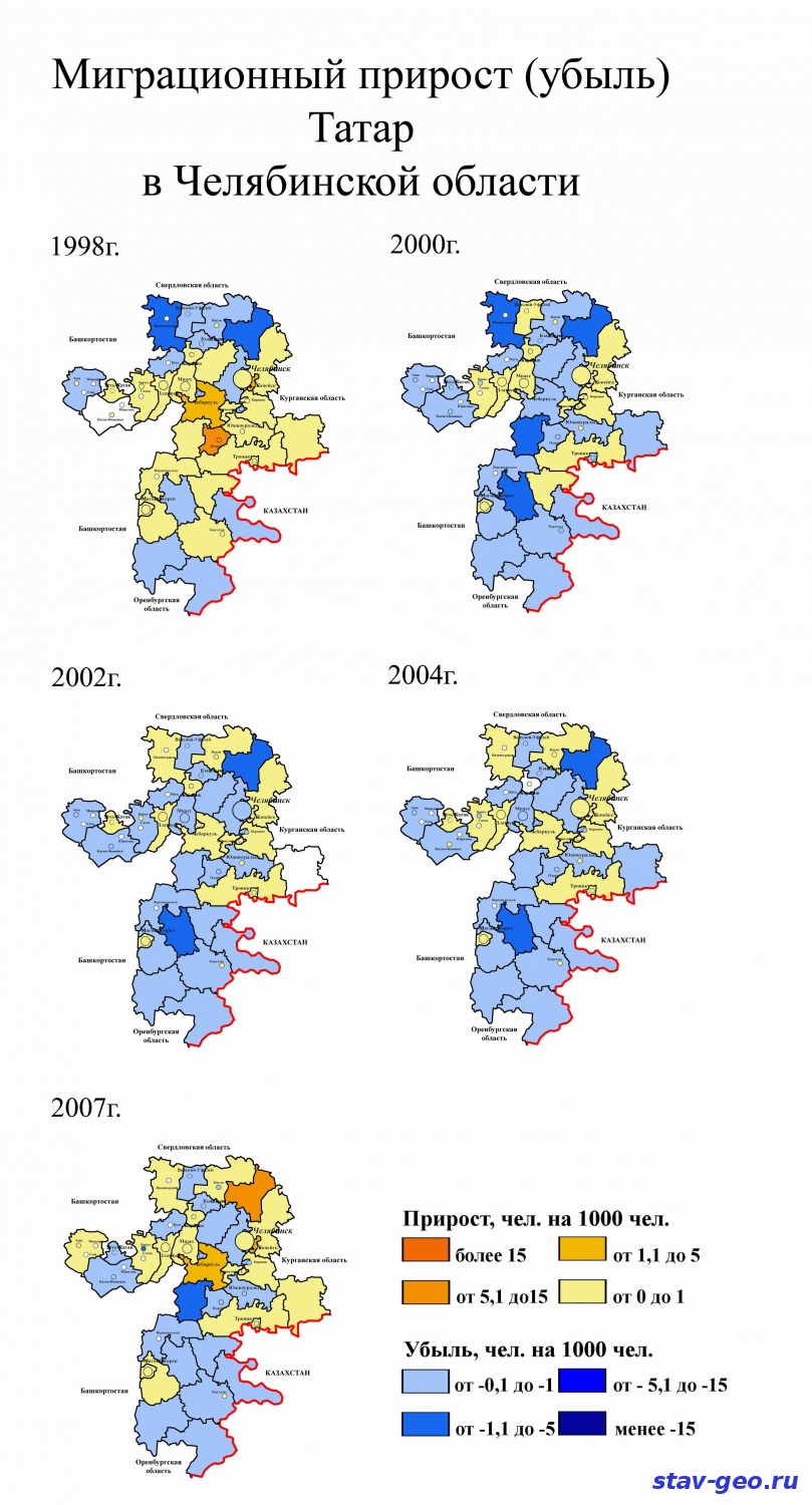 Если среди славянских национальностей самыми миграционно настроенными оказались русские, то второе место среди всех эмигрантов Челябинской области занимают татары. За весь исследуемый период, прибыло 16262 чел., выбыло 15592 чел., прирост составил 670 чел., (2,6%) от общей эмиграции. В 1998г. наблюдался максимальный миграционный прирост татар в область (740 чел.) это 4,2% от всех национальностей. Наибольший коэффициент прироста зафиксирован в Пластовском районе (7,6‰), Еткульский (0,5‰),Чебаркульский (1,1‰), г.Челябинск (0,3‰), Троицкий (0,6‰), г.Магнитогорск (0,5‰), Чесменский район (0,7‰), г. Аша (0,8‰), г.Южноуральск и г.Карталы по 10,3‰. Убыль в Сосновском (-0,3‰), Нагайбакском (-1,1‰); Каслинском, Варненском, Ашинском по (-0,2‰). максимальная убыль в Нязепетровском (-1,6‰), Кунашакском (-2,9‰), в г.Верхний Уфалей (-0,8‰). Небольшой прирост: Увельский (0,1‰), Верхнеуральский (0,1‰), Отябрьский, саткинский по (0,4‰), г.Карталы, г.Златоуст по 0,1‰. В восточных районах области наблюдался прирост, в северных убыль. Ситуация в целом по области в 2000г. ухудшилась. Основная масса приехавших татар в Челябинскую область уезжала. Прирост составил 4 чел., (0,05%). В девяти районах только небольшой коэффициент прироста, в остальных убыль. Нязепетровский район увеличил коэффициент убыли в 2 раза (с - 1,6‰ до -3,3‰), в Кунашакском районе с (-2,9‰) до (-4,0‰). В Красноармейском и Кизильском прирост составил в 8 раз (0,8‰), г.Карабаш увеличение прироста в 4 раза до 0,4‰, г.Златоуст в 2 раза (0,2‰). Согласно переписи 2002г. область имела убыль (-1562 чел.) из них 10% татаров. Количество районов имеющих коэффициент миграционного прироста данной нации ещё больше сократилось, до шести. Максимальная убыль в Кунашакском районе (-3,5‰), и Нагайбакском (-0,7‰). Зарегистрирована убыль в Челябинске (-0,03‰), в г.Миасс (-0,2‰), г.Верхний Уфалей (-0,7‰). В Златоусте, Карабаш, Южноуральске, Магнитогорске коэффициент прироста не изменился. В Октябрьском районе число прибывших равнялось числу выбывших данной национальности. Убыль по области в 2004г. увеличилась вдвое, но среди татар процент уменьшился с 10% до 7%. Картина расселения эмигрантов по области не изменилась. Только город Челябинск сменил коэффициент убыли на незначительный прирост 0,01‰. Из Республики Казахстан прирост составил 21%. И приграничный с Костанайской областью Октябрьский район также начал терять население. В 2007г. ситуация в области изменилась от убыли к приросту. Общий коэффициент миграционного прироста по татарам увеличился в 3 раза и составил 0,3‰. район особо выделился, Кунашакский район коэффициент здесь вырос от -3,9‰ до 5,1‰ и Чебаркульский район от 0,1‰до 3,0‰. Активный прирост наблюдался в северо-восточных приграничных районах: Октябрьский от -0,1‰ до 0,4‰, в Троицком районе прирост в 2 раза, до 0,5‰, в Еткульском районе в 2,5 раза, до 0,5‰, Еманжелинском в 2 раза. на западе области в Ашинском районе от -0,0‰3 до 0,2‰; в центральной части области Саткинский район увеличил прирост вдвое от 0,3‰ до 0,6‰. Только в г. Челябинск коэффициент миграционного прироста среди татар вырос в 20 раз (от 0,01‰ в 2004г. до 0,2‰ в 2007г.). | |