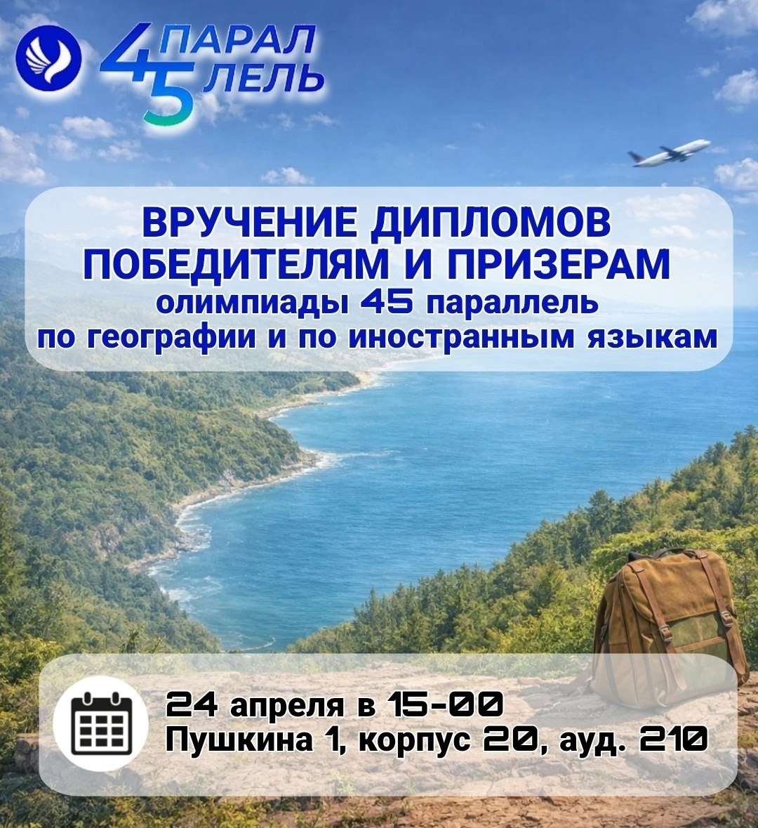 С радостью сообщаем, что скоро состоится торжественное вручение дипломов победителям и призёрам олимпиады «45 параллель» по географии и иностранным языкам!