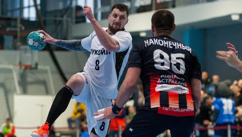 На третьей минуте левый крайний местного коллектива Альберт Гумаров в первый и последний раз вывел хозяев вперёд – 2:1. После этого инициативой завладели гости, которые методично осаждали чужие владения и постепенно увеличивали отрыв. Этому весьма способствовала надёжная игра на последнем рубеже вратаря Станислава Третынко и горячая поддержка болельщиков — в Астрахани в этот день высадился внушительный ставропольский фан-десант, обеспечивший на астраханских трибунах «викторианцам» практически домашнюю поддержку. В середине первого тайма левый полусредний приезжей команды Павел Тураев мощным дальним броском довёл перевес визитёров до четырёх пунктов – 11:7, однако динамовцы и не думали сдаваться: любимцы местной публики продолжали атаковать большими силами, и к перерыву смогли сократить отставание до двух точных выстрелов – 16:14 в пользу южной дружины. Астраханцы лишь в начале игры перехватили инициативу, но вскоре ставропольцы вырвались вперёдФото: ГК «Динамо» (Астрахань)Во второй половине встречи Станислава Третынко в ставропольских воротах сменил Александр Лысенко, который также продемонстрировал высокий класс и прекрасную реакцию, совершив шесть сейвов. Его партнёры тем временем продолжали атаку: на 36-й минуте правый крайний Никита Кириленко впервые увеличил отрыв гастролёров до пяти баллов – 21:16. «Догонялки» продолжались практически до последних минут, но ставропольцы сохранили лидерство и победили с разницей в четыре мяча — 34:30. По пять голов в динамовские ворота забили Павел Тураев и правый крайний Тимофей Масленников, по четыре раза цель поразили линейные Павел Максимов и Михаил Пилюк, а также левый крайний Дмитрий Лукинов. Следующий поединок национального первенства «Виктор» проведёт 26-го марта – в этот день в Ставрополе будет гостить «Динамо-Сунгуль» из Снежинска. Ставропольские гандболисты завершили игру со счётом 34:30