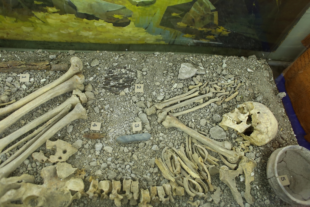 Один из экспонатов музея вызывает особое внимание. Не так давно, в центре города, при рытье котлована под фундамент магазина (ул. Ленина, 100а) были найдены древние захоронения Кобанской культуры. Единственное, ещё не разрушенное экскаваторами, вскрыли археологи: в могильнике из каменных плит оказался скелет лежащего на боку воина. У пояса лежал колчан со стрелами и оселок с ножом, у колен наконечник копья, в изголовье керамическая чаша. В этом же виде захоронение представлено в музее.