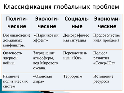 Глобальные проблемы — это явления, которые охватывают весь мир, угрожают существованию человечества и требуют совместных усилий разных стран для их решения. Их можно классифицировать по разным критериям.