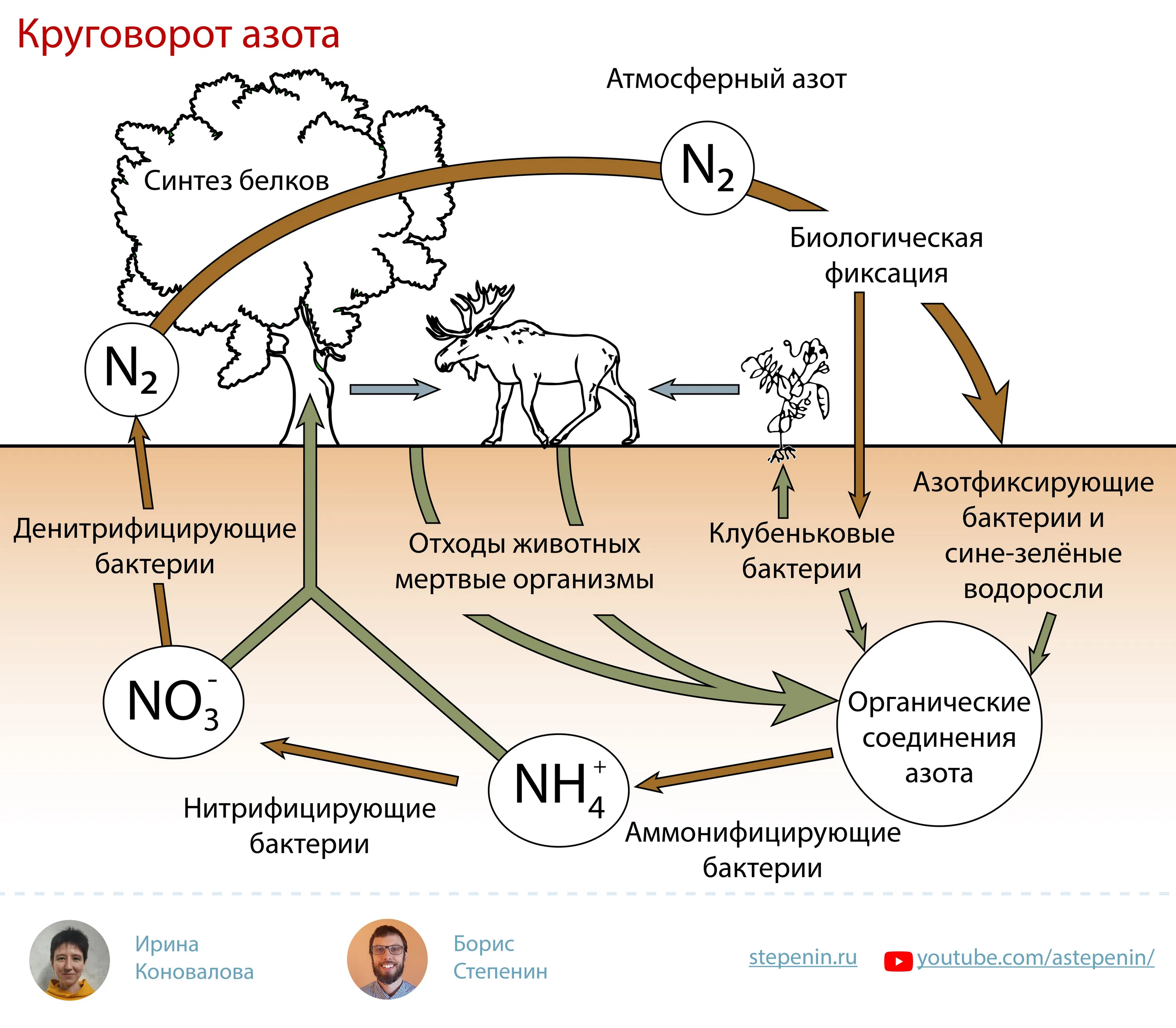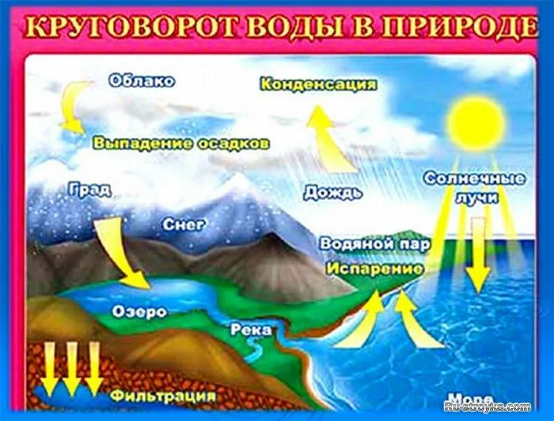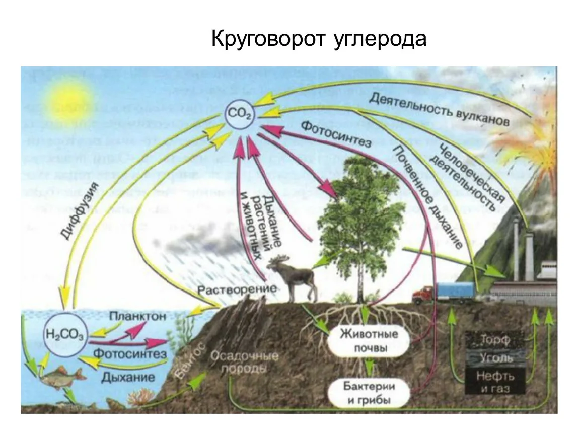 Основные понятияКруговороты веществ — циклическое перемещение атомов из неживой природы в живые организмы и обратно. Они происходят благодаря взаимодействию биотических (биосфера) и абиотических (литосфера, атмосфера, гидросфера) частей Земли. Биогеохимический цикл — система незамкнутых и необратимых круговоротов веществ на Земле. Этот термин ввёл В. И. Вернадский, разработавший теорию биогеохимических циклов в учении о биосфере. Географическая оболочка — целостная и непрерывная оболочка Земли, объединяющая нижние слои атмосферы, верхние слои литосферы, всю гидросферу и биосферу. В ней происходят активные взаимосвязи между компонентами. Основные круговороты веществКруговорот воды Это глобальный процесс циркуляции воды между океаном, атмосферой и сушей. Вода испаряется с поверхности водных бассейнов, в виде пара попадает в воздушные массы, формирует облака и тучи. Затем атмосферные осадки (дождь, снег, град) выпадают на землю, восполняя недостаток влаги в водных бассейнах и увлажняя почву, которая питает растения. После этого влага снова испаряется в атмосферу, и цикл повторяется. Виды круговорота воды: Малый (океанический). Вода испаряется над поверхностью суши или океана, а потом вновь попадает в океан. Внутриконтинентальный. Вода, испарившись над континентальной частью Земли, на неё же и возвращается в виде осадков. Круговорот воды в природе. Путешествие капельки Круговорот углерода Углерод перемещается между атмосферой, растениями, животными, океанами и землёй. Ключевые этапы: Поступление углерода в атмосферу. Углекислый газ поступает в атмосферу в результате дыхания живых организмов и горения. Поглощение углекислого газа растениями. Фотосинтезирующие организмы (растения и водоросли) преобразуют углекислый газ в органические вещества, используя энергию Солнца. Прохождение углеродных соединений в пищевой цепи. Углерод передаётся от растений к животным при поедании. Возврат углерода в атмосферу. Разлагатели (бактерии и грибы) при разложении органических веществ выделяют углекислый газ. Круговорот кислорода Кислород перемещается между гидросферой, атмосферой, литосферой, растениями, животными и другими живыми существами. Растения в процессе фотосинтеза выделяют кислород в атмосферу, а животные и растения при дыхании потребляют его и выделяют углекислый газ. Круговорот азота Азот — важный элемент, необходимый живым организмам для построения тканей и синтеза ДНК. Круговорот азота включает преобразование азота из атмосферы в доступные для организмов соединения и обратно. Схему круговорота условно можно разделить на две части — грунтовую и атмосферную. В почве в результате гниения органических веществ (растений, животных) азот превращается в аммиак. Под действием бактерий аммиак окисляется до азотной кислоты, которая вступает в реакцию с элементами почвы, образуя нитраты. Нитраты поглощают растения. Значение круговоротов веществ Круговороты веществ обеспечивают: поддержание жизни на Земле при ограниченных запасах химических элементов; обмен веществ и энергии между различными компонентами природы; устойчивость экосистем. Понимание этих процессов важно для сохранения природного равновесия и рационального использования ресурсов планеты. | |