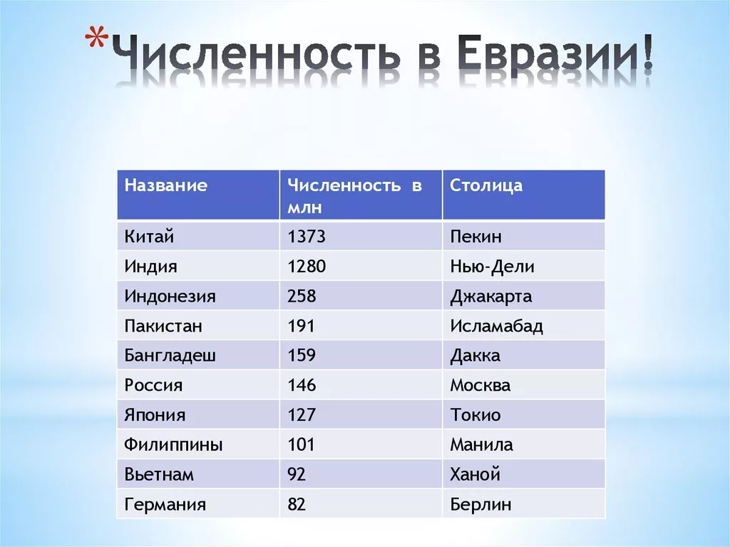 Крупнейшие по численности населения страны Евразии