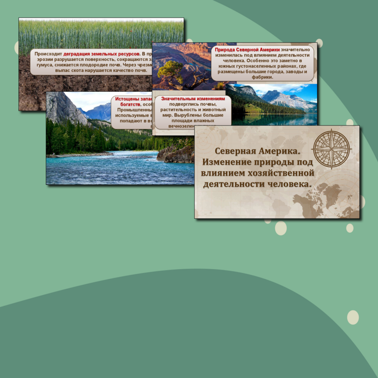 В уроке по географии для 7 класса на тему «Северная Америка. Изменение природы под влиянием хозяйственной деятельности человека» можно рассмотреть последствия вырубки лесов, загрязнения водоёмов, истощения почв и изменения климата.