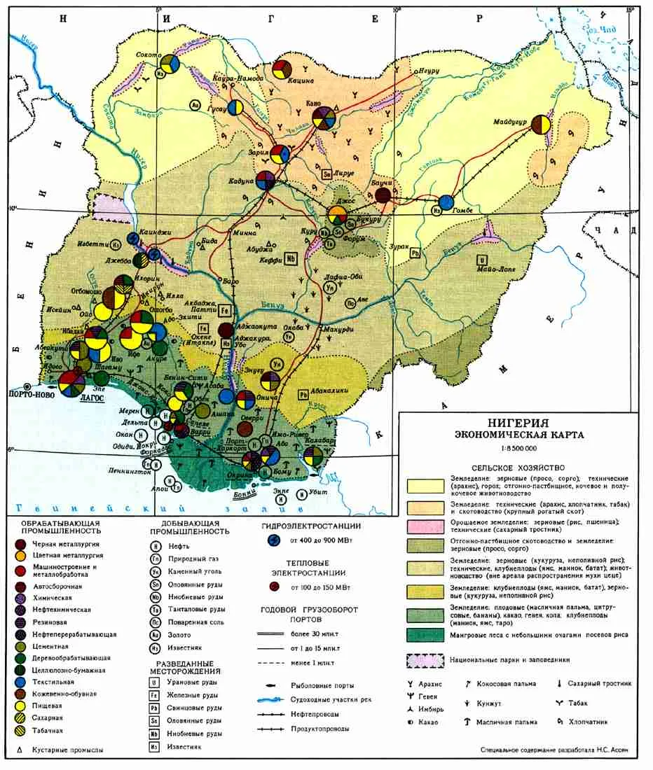 География Западной, Центральной и Восточной Африки: Особенности природно-ресурсного капитала, населения и хозяйства НигерииЗападная Африка расположена к юго-западу от центральной Сахары, омывается Атлантическим океаном с запада и юга, естественная граница на востоке — Камерунские горы. Регион охватывает Сахель, Судан и тропические леса гвинейского региона с переменно-влажным климатом из-за пассатных ветров, сезоны засух и дождей. В Сахеле мало растительности, в Судане — саванны, у побережья — тропические леса. Это одна из богатейших минерально-сырьевых кладовых мира: запасы марганца, олова, золота, алмазов, железной руды, нефти и газа. Крупнейший поставщик нефти — Нигерия. Рельеф включает невысокие выровненные поверхности (200–400 м), мангровые леса, лагуны, влажные тропические леса, реки с водопадами. Центральная Африка включает побережье Гвинейского залива и котловину реки Конго с экваториальным климатом и крупнейшими массивами вечнозелёных лесов, эндемичными видами животных и растений. Реки полноводны, котловина Конго — впадина диаметром 1000 км на высоте 300–500 м. Восточная Африка (данные в источниках ограничены, но регион известен рифтами, вулканами и саваннами; подробности требуют дополнительных источников). Нигерия: Особенности природно-ресурсного капиталаНигерия — крупнейшая по населению страна Африки в Западной Африке, крупнейший поставщик нефти и газа в регионе. Богата какао-бобами, пальмовым маслом. Недра содержат железные руды, марганец, бокситы, олово, золото, алмазы. ЭГП развито выше, чем в Восточной Африке, но ниже Северной. Население НигерииНигерия — самая большая по численности страна континента (около 210 млн в регионе Западной Африки). Сложный этнический состав, разноязычие затрудняют интеграцию. Регион многонационален, нестабилен экономически и политически. Хозяйство Нигерии и регионаДоминирует сельское хозяйство с монокультурностью: какао (Нигерия, Гана, Кот-д'Ивуар), арахис (Сенегал), пальмовое масло (Нигерия). Горнодобыча специализирована: нефть в Нигерии, бокситы в Гвинее. Страны — среди беднейших, несмотря на ресурсы. | |