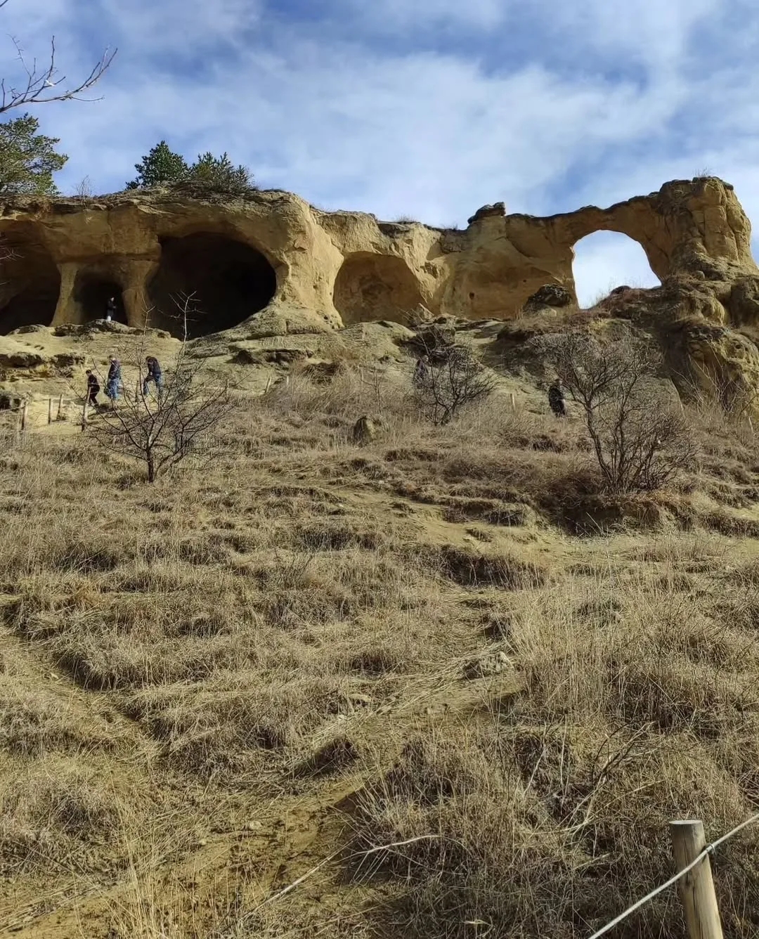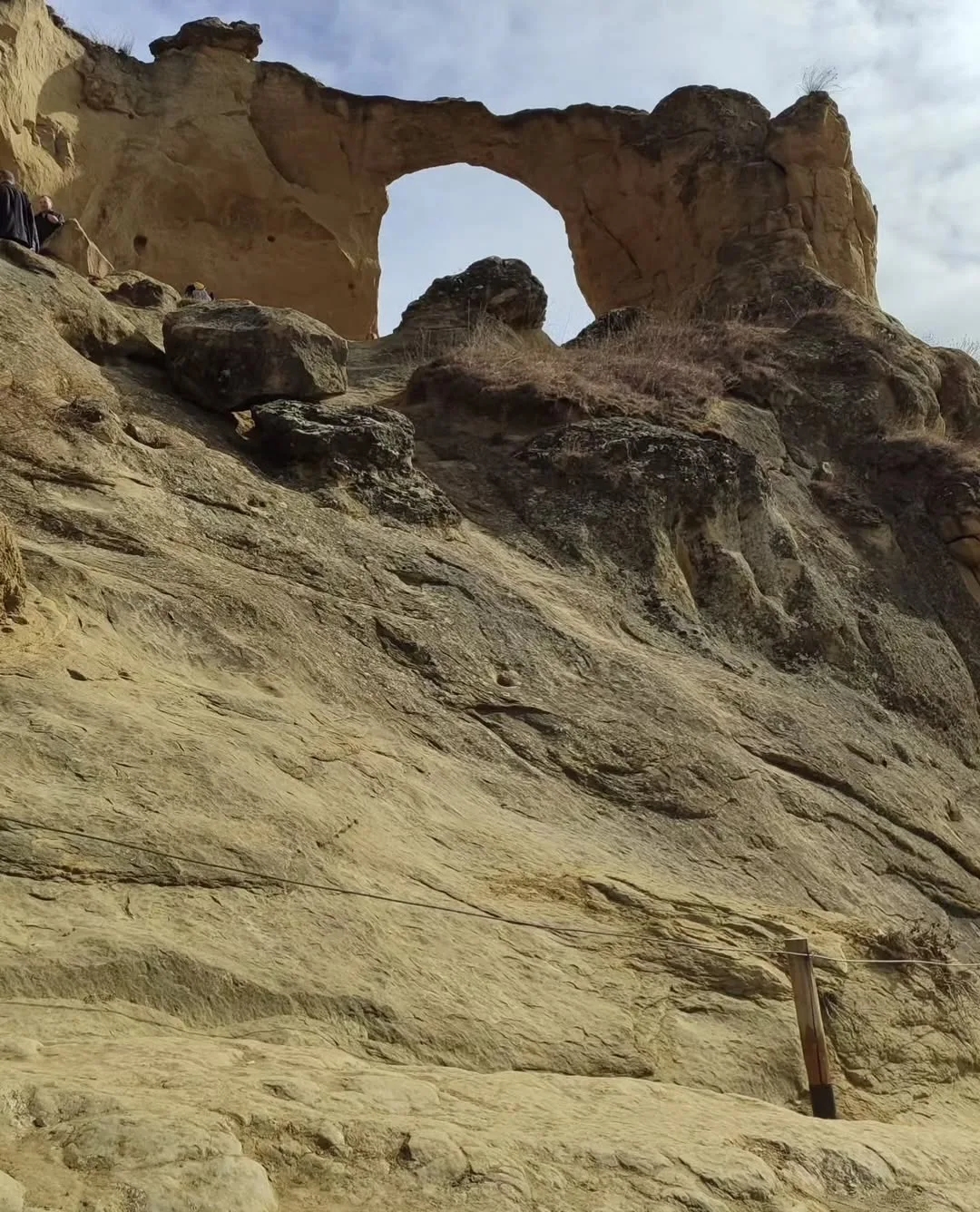 Это не просто скала, а огромная каменная арка с круглым отверстием, будто вырезанным в породе. Издалека она действительно выглядит как гигантское кольцо, зависшее над ущельем.