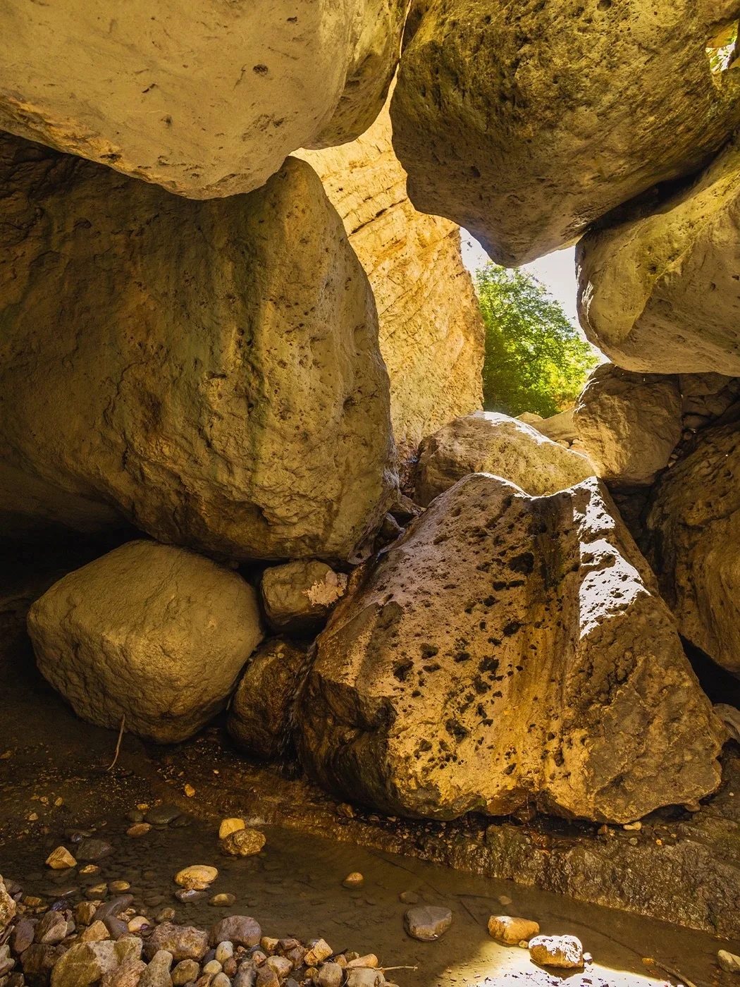 По пути встречаются огромные валуны, застрявшие между стенами на высоте — последствия древних камнепадов. А на выходе можно заметить дикие пчелиные ульи прямо в скалах.