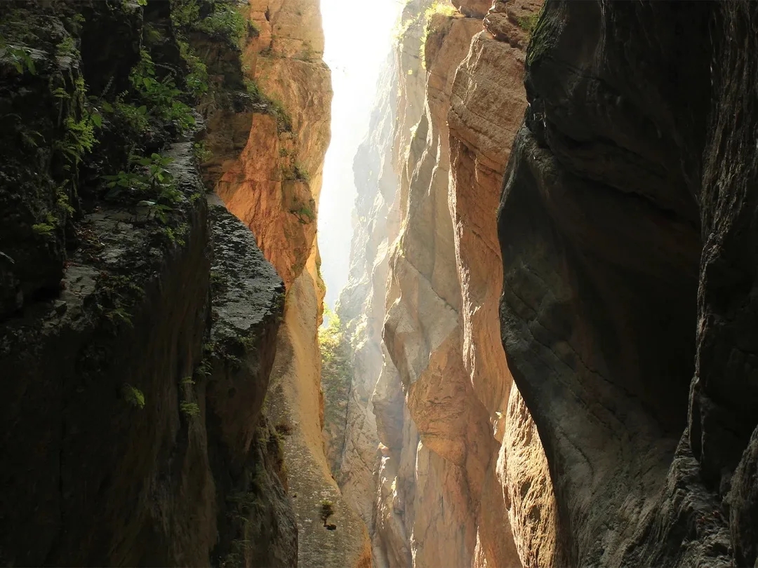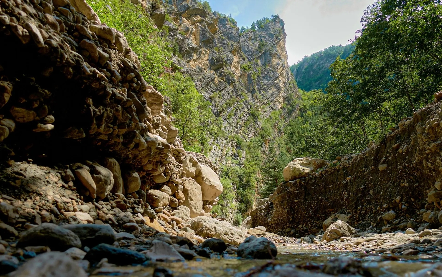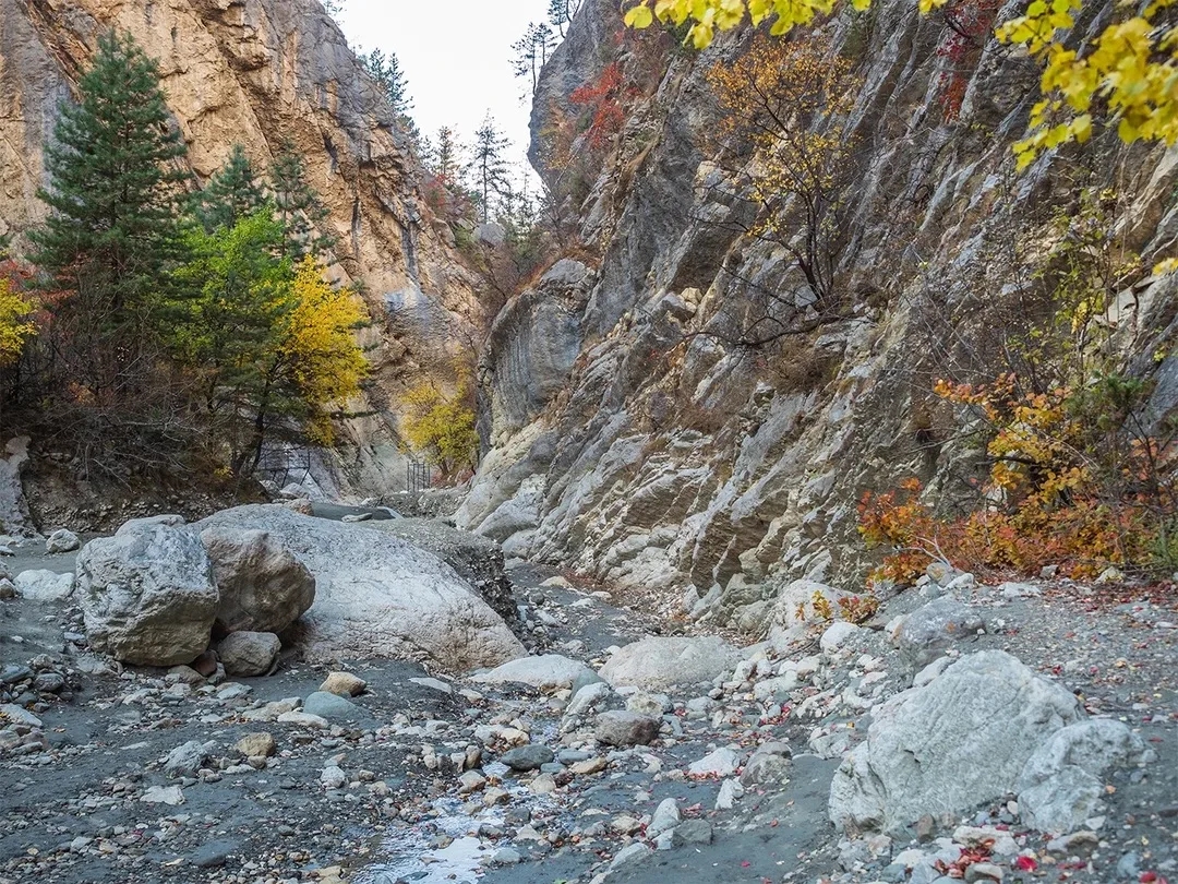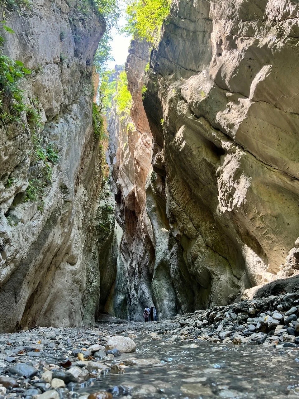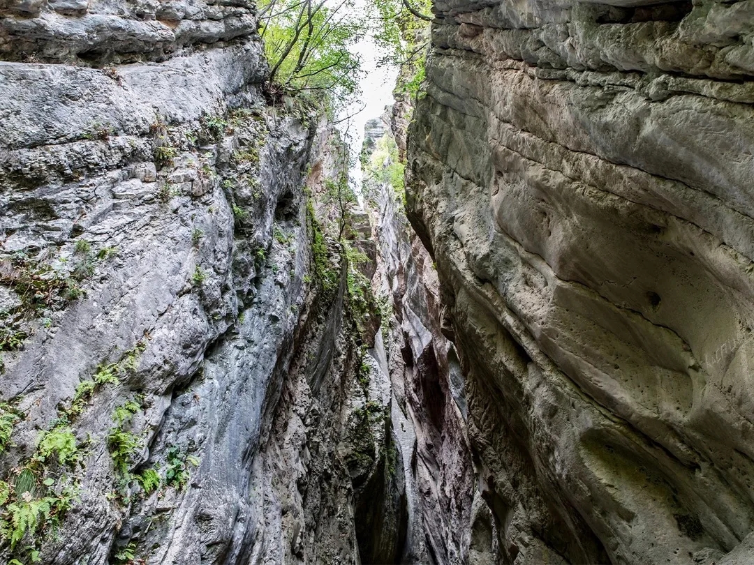 Теснину создала река Квартал: за тысячи лет она вымыла этот узкий каменный коридор. Сейчас от бурного потока остался небольшой ручей, но масштабы впечатляют.