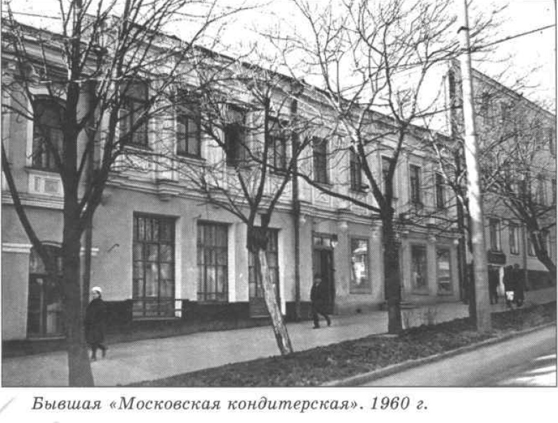 Впритык к зданию бывшей "старой гимназии" сегодня стоит двухэтажный каменный дом с кафе и магазином. Между ними - проход вглубь усадебного места с выходом на параллельную улицу Орджоникидзе [2, с. 30]. Первым хозяином этого усадебного места, сразу за "старой" гимназией на Николаевском проспекте, был купец Дьячков-Тарасов. Фасадом на Большую Черкасскую, как тогда именовался Николаевский проспект, он возвел небольшой двухэтажный дом, в котором открыл торговую лавку. В 1838 году в здании расположилось областное Кавказское правление с архивом, затем- Ставропольская комиссариатская комиссия, ведавшая снабжением войск Кавказской линии и Черномории провиантом и обмундированием [2, с. 30]. В дальнейшем усадебным местом владел Фрол Яковлевич Дьячков-Тарасов, затем есаул войска Донского Павел Степанович Полушкин, далее Варфоломей Яковлевич Попов, потом ейский купец Иван Котельников [1, с. 407]. Сын Якова Фрол, а затем его внук Василий перестроили старый дом, в глубине усадьбы возвели ещё один в два этажа, а также конюшни, баню и прочие хозяйственные службы, открыв здесь заезжий двор [2, с. 30]. Многочисленный род Дьячковых-Тарасовых оставил значительный след в истории не только Ставрополя, но и Екатеринодара - как в делах торговли, образования и культуры, так и в благотворительности [2, с. 30]. В 1858 году есаул Войска Донского Павел Степанович Полушкин купил за 4140 рублей серебром все усадебное место Дьячковых-Тарасовых и продолжал использовать его как заезжий двор, теперь уже ставший именоваться "Есауловским" [2, с. 30]. В начале 60-х годов XIX века Полушкин продал усадьбу со всеми строениями купцу и предпринимателю Варфоломею Яковлевичу Попову, который через двадцать лет перепродал ее ейскому купцу Ивану Котелкину. Последний рядом с двухэтажным домом фасадом на Николаевский проспект построил еще такой же. И, наконец, новым хозяином всего подворья становится московский кондитер Николай Кириллович Челядинов, который оба дома по Николаевскому проспекту объединяет в один, оставляя между ними узкий проход на уровне первого этажа, сохранившийся до сегодняшнего дня [2, с 31]. В нижнем этаже правого, или западного крыла объединенного дома он устроил пекарню, а в левом, представляющем из себя большой зал, открыл вскоре ставшую широко известной "Московскую кондитерскую"[1, с. 407]. Кондитерская Челядинова предлагала покупателям самую разнообразную продукцию: ванильные сухарики, рулеты, кексы, печенье, торты, пирожные, слойки, куличи, кренделя, обыкновенные и фигурные ромовые бабы, пирожки и пироги с орешками, изюмом, медом, шоколадом, кремом и вареньем... "Челядиновские" торты были отмечены российскими дипломами и Большой Серебряной медалью на Всемирной выставке в Риме. Макет этой медали украшал витрину "Московской кондитерской", а оттиски с медали красовались на кондитерских коробках и счетах кондитерской [2, с. 31]. Здесь же, в кондитерской Челядинова, за специальными столиками с венскими стульями можно было отведать, наряду с соками местных заводов, какао и кофе лучших фирм Европы и Америки, в том числе особенно полюбившиеся горожанам какао французской фирмы "Ван Гутен", сахарную или медовую халву, шербет, конфеты местных фабрик Владимира Рощина и братьев Макаровых; сладости московской фабрики Абрикосова: конфеты "Виктория", "Принцесса", "Алая роза", пастилу "Ранет", "Боярск