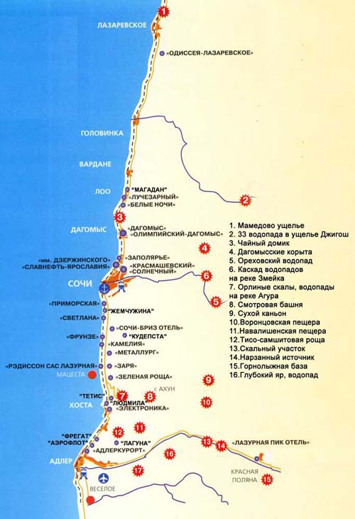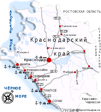 Неповторимая красота черноморского побережья Краснодарского края, изумительные пейзажи, горы Западного Кавказа, покрытые густыми лесами, ледниками, альпийскими лугами и плодородные равнины Кубани, субтропики Причерноморья, многокилометровые песчаные пляжи из золотистого песка, мягкий морской климат – вот далеко неполный перечень природного разнообразия, делающего отдых в Краснодарском крае сравнимым с райским наслаждением. По разнообразию природных ландшафтов, великолепному сочетанию и уникальности многих из них – равнин, горных вершин с вечными снегами, яркой субтропической зеленью, безбрежной лазури Черного моря, целебных минеральных источников и лечебных грязей – отдых в Краснодарском крае не имеет аналогов в России. Отдых в Краснодарском крае - это отдых в жемчужине России, обладающей богатейшими холодными и термальными минеральными лечебными источниками в сочетании с мягким субтропическим морским климатом. Все это снискало Краснодарскому краю славу российской и мировой здравницы. Краснодарский край занимает обширную территорию более 76 тыс. кв. км. Административный центр края – г. Краснодар. Другие крупные города - Сочи, Новороссийск, Армавир. Краснодарский край расположен на юге Европейской части России в северо-западной части Большого Кавказа (высота до 3256 м. над уровнем моря). Омывается на юго-западе водами Черного моря, на северо-западе – Азовского моря и Керченским проливом. На юге – Кубано-Приазовская низменность, на востоке - окраина Ставропольской возвышенности. В береговой линии Черного моря выделяются Геленджикская и Цемесская бухта, полуострова Таманский и Абрау, на побережье Азовского моря – Ейский, Бейсугский лиманы. ДжубгаДжубга в переводе с адыгейского - это "место, где воздух расстилается" или попросту "Долина ветров". Действительно, долина реки Джубга уходит далеко в горы. Коренные жители этих мест - шапсуги, заметили, что в этой долине, даже в самый теплые дни, дует сильный ветер. По другой версии Джубга переводится, как Ночная красавица. Курортный поселок Джубга расположен в 80 км от Туапсе, на берегу небольшой бухты. Поселок известен как великолепный курорт с мягким климатом. В настоящее время здесь проживает 4 тысячи жителей. Цены на проживание здесь ниже, нежели в самом Туапсе. Есть поселочный пляж, протяженностью около 800 метров. Он состоит в основном из песка, галечника и многих каменных участков. Дно моря у берега ровное, без скальных выступов. Глубина увеличивается постепенно. Джубгская бухта ограничивается с востока мысом Шапсухо, а с запада горой Ежик. Гора и в самом деле очень похожа на ежика, который пришел к морю попить воды. На выезде из поселка Джубга слева от дороги стоит скульптура динозавра. Это творение местного скульптора-самоучки, который живет по соседству. На сегодняшний день Джубга - это цветущий, благоухающий курортный поселок, с галечно-песчаным пляжем и мягким морским климатом, поселок, который с каждым годом становится все краше и краше. ДжеметеДжемете - Пионерский проспект район Анапы. "Джемете" в переводе означает "золотой песок", и это название не случайно здешние пляжы это 10 км чистого лечебного песка шириной до 100 метров, на всем протяжении пляжа живописные песчаные дюны, покрытые уникальной растительностью. Ровное песчаное дно моря создает идеальные условия дл