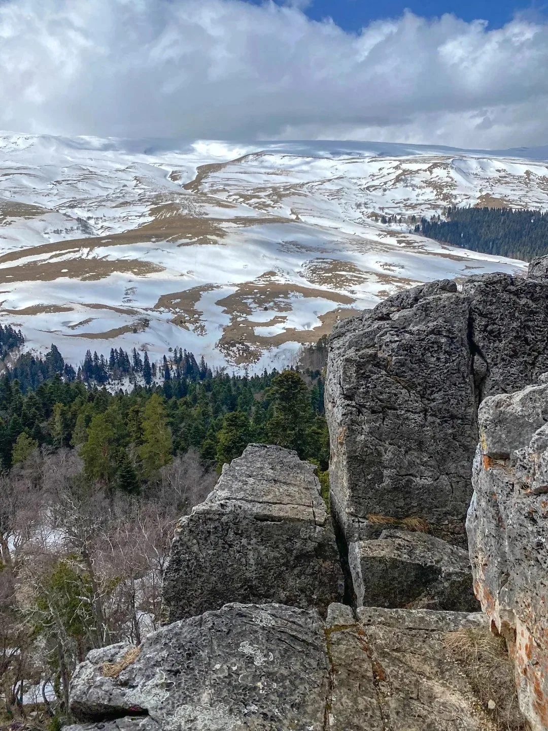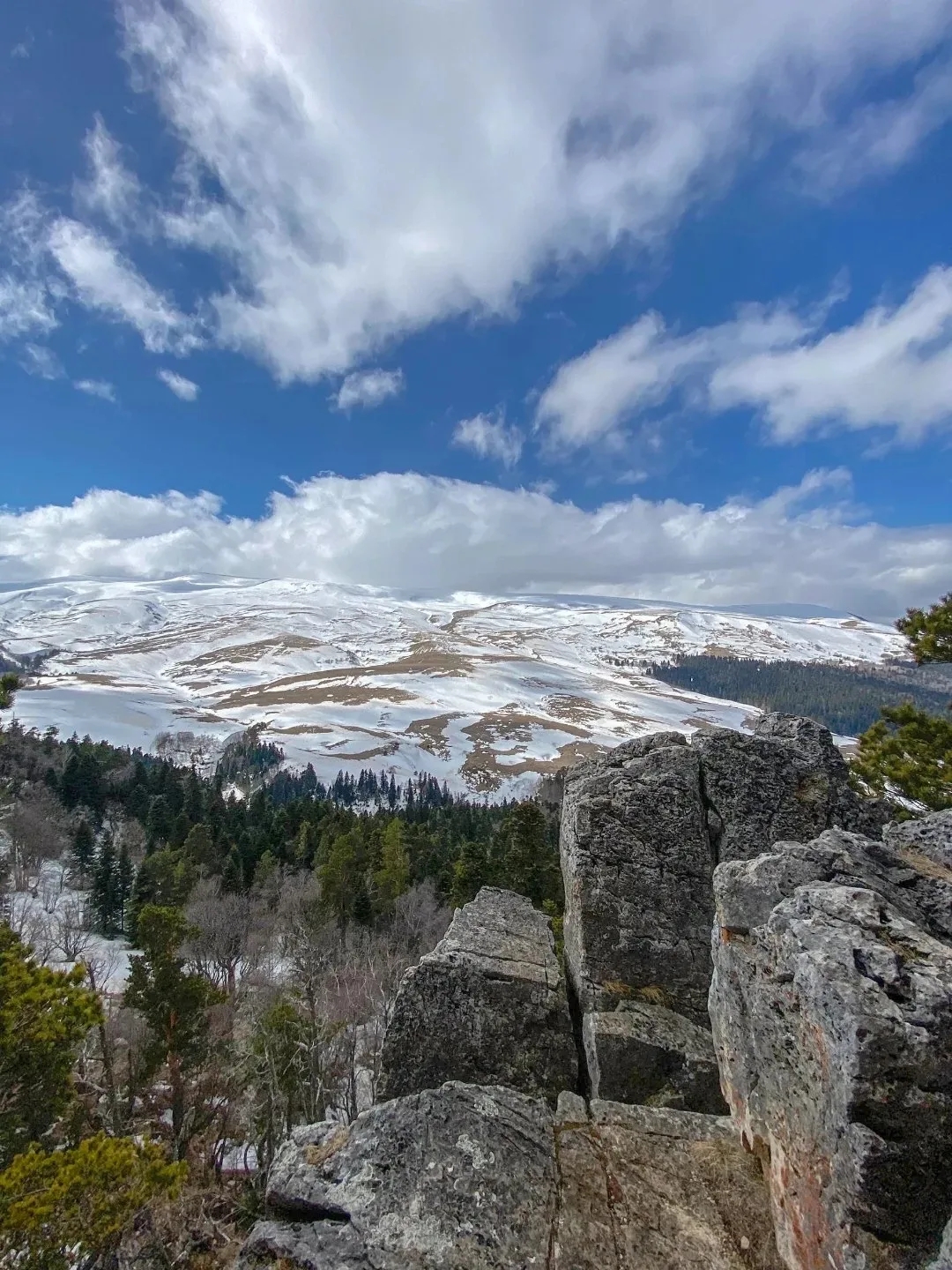 Весна в горах приходит не сразу — она поднимается постепенно, словно волна. Внизу, в предгорьях Адыгеи, уже тепло, воздух наполнен солнцем и ветром. А выше, в горах, зима только начинает отступать. На склонах еще лежит снег, но сквозь него уже пробиваются первые цветы. Высокогорные луга Лагонаки освобождаются медленно: белое полотно тает пятнами, и кажется, будто по нему разлили какао. Это короткий, но очень красочный момент — переход между сезонами, который не повторяется дважды одинаково. Один из лучших видов на плато открывается со скалы Утюг у Азишского перевала. С высоты около 1800 метров перед тобой весь масштаб Лагонаки: мягкие хребты, заповедные луга, темные пихтовые леса и глубокие ущелья с бурными реками. Даже несмотря на ограничения в заповеднике здесь есть где гулять. Смотровые площадки, пещеры, водопады и горные дороги — всё это доступно круглый год и особенно красиво именно сейчас, когда природа только просыпается.