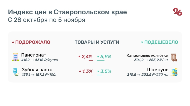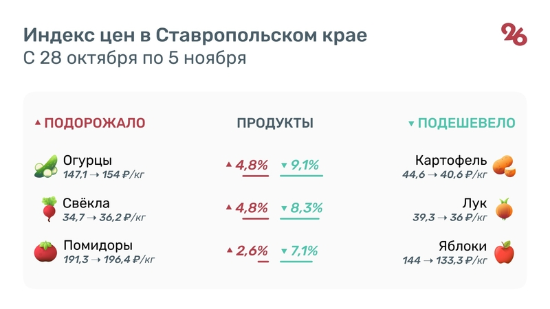 За неделю огурцы подорожали с 147,1 до 154 руб/кг (+4,8%), свёкла — с 34,7 до 36,2 руб/кг (+4,8%), помидоры — с 191,3 до 196,4 руб/кг (+2,6%).Фото: ИА «Победа26»В то же время картофель подешевел с 44,6 до 40,6 руб/кг (-9,1%), лук — с 39,3 до 36 руб/кг (-8,3%), а яблоки — с 144 до 133,3 руб/кг (-7,1%). Фото: ИА «Победа26»День пребывания в пансионате подорожал с 4182 до 4318 руб/сутки (+2,4%), а цена зубной пасты выросла с 155,1 до 157,2 руб/100 г (+1,3%). Среди непродовольственных товаров и услуг подешевели на Ставрополье капроновые колготки — с 301,2 до 285,9 рублей за штуку (-5,9%), и шампунь — с 210,5 до 203,5 рублей за 250 мл (-3,5%). Поделиться в: Следующий