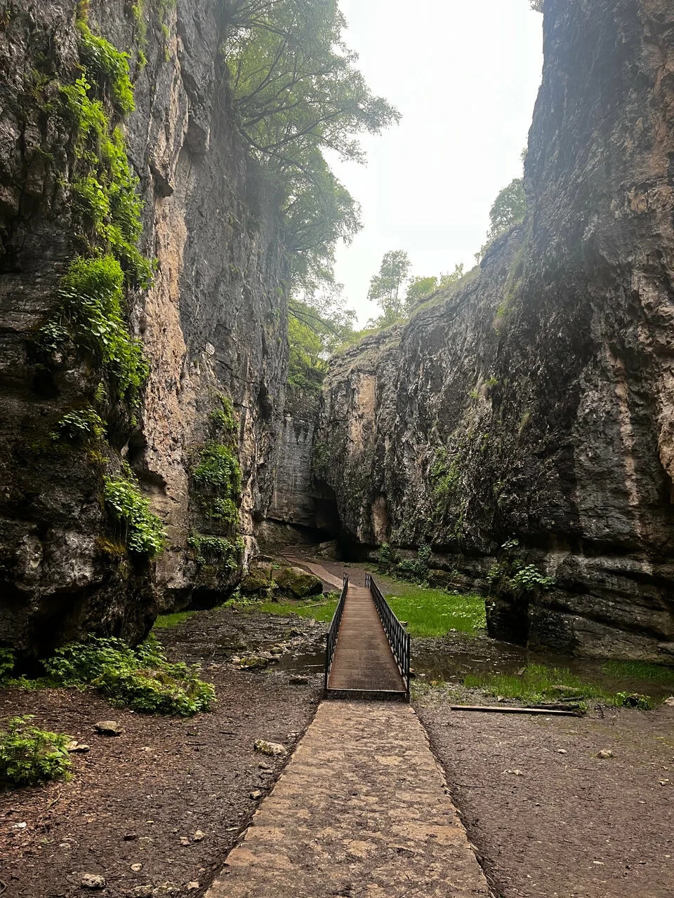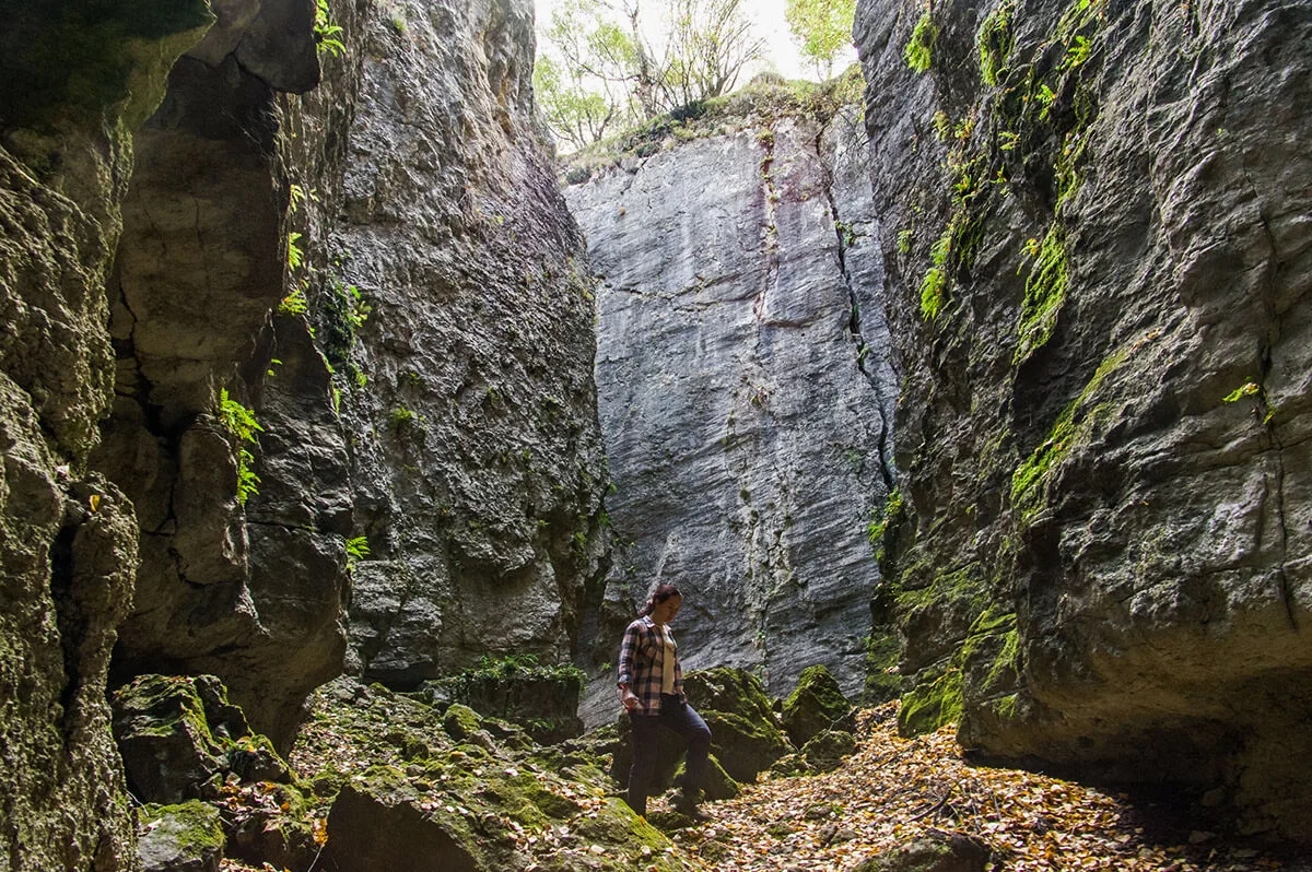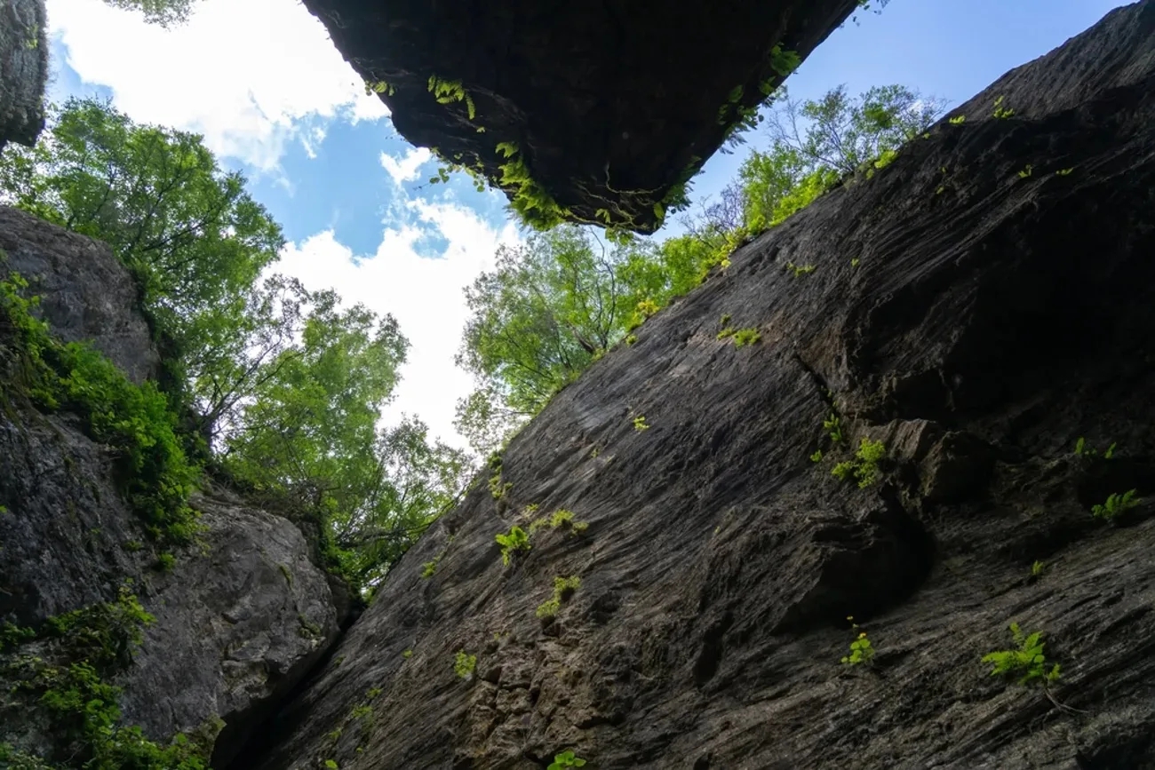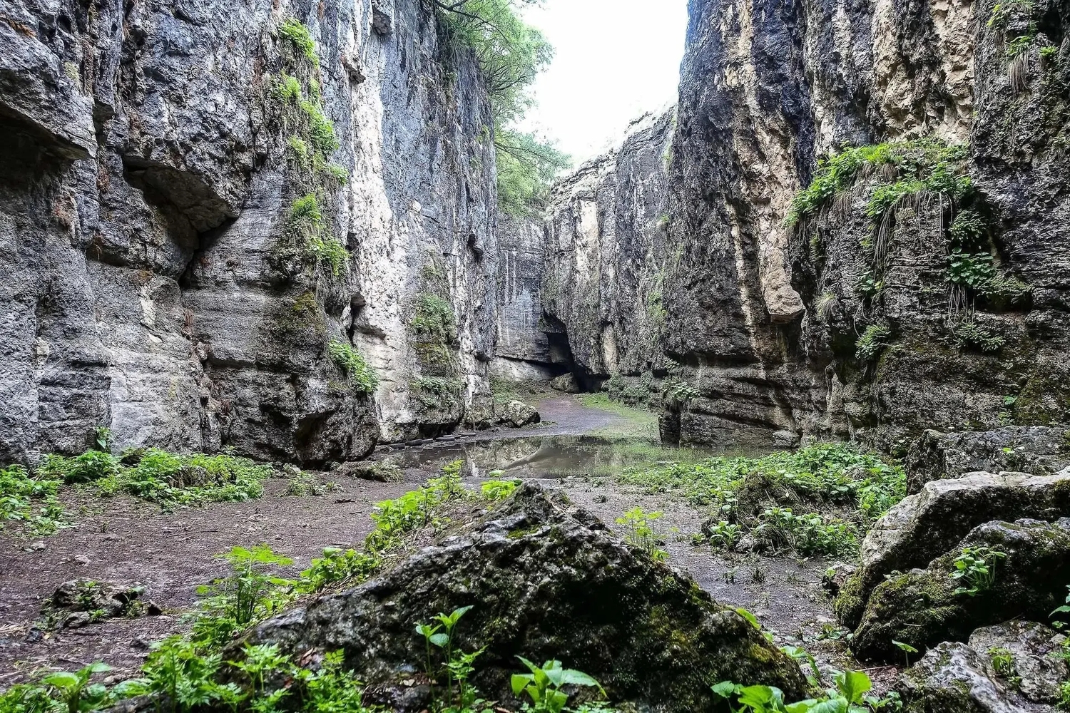 Скалы покрыты мхом, где-то пробиваются растения, а по стенам стекают тонкие ручьи. После дождя место превращается почти в пещеру — мокро, скользко и максимально атмосферно.