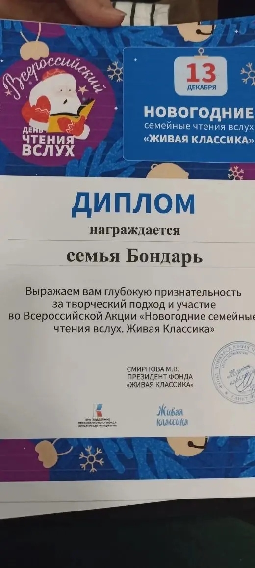 30 января 2026 г. в МБОУ СОШ №25 ученики нашей школы и их семьи были награждены дипломами победителей и участников Всероссийской просветительской акции «Новогодние семейные чтения вслух. Живая классика», которая прошла 13.12.2025 г.