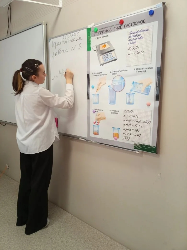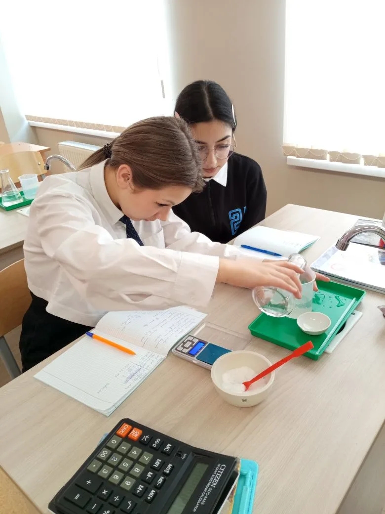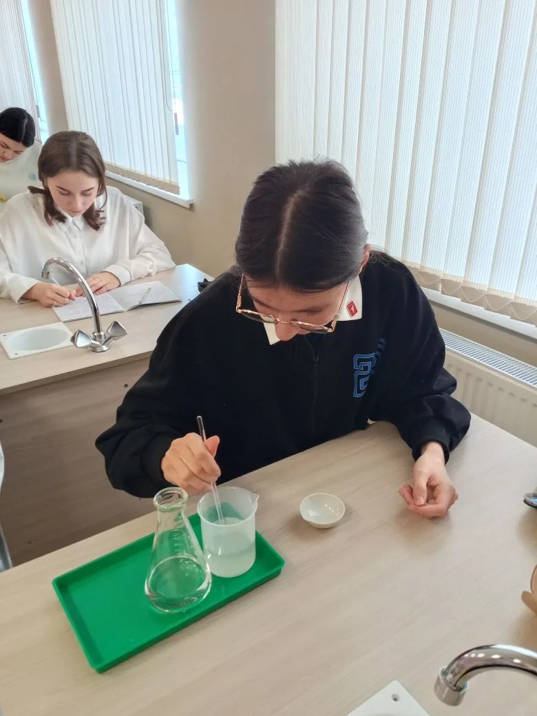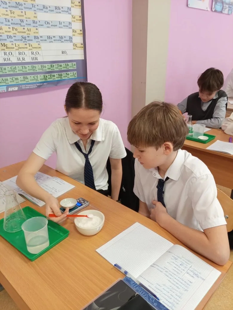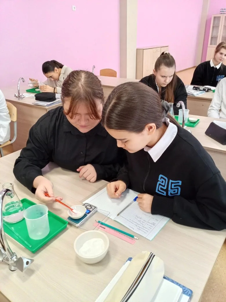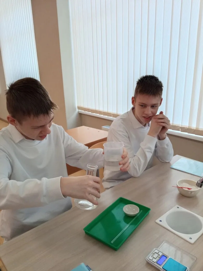В 8-х классах прошел урок на одну из самых ответственных и увлекательных тем курса химии — практическая работа по приготовлению раствора соли с заданной массовой долей растворенного вещества. Целью занятия стало закрепление теоретических знаний о составе растворов и отработка навыков работы с лабораторным оборудованием. Прежде чем приступить к практике, ребята провели необходимые математические расчеты: вычислили массу соли и объем воды, нужные для получения раствора конкретной концентрации. Затем началось самое интересное — работа «в парах». Восьмиклассники учились: взвешивать вещества на весах; точно отмерять объем жидкости с помощью мерных цилиндров; правильно смешивать компоненты до полного растворения.