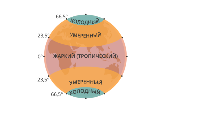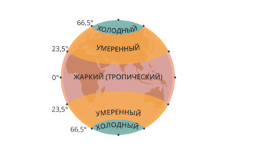 Тропики и полярные кругиТропики — параллели, где Солнце раз в год в зените: Северный тропик Рака (23°26′ с.ш.), Южный тропик Козерога (23°26′ ю.ш.). Полярные круги — границы полярных поясов: Северный полярный круг (66°34′ с.ш.), Южный полярный круг (66°34′ ю.ш.). Наклон оси Земли усиливает неравномерность, вызывая смену сезонов. | |