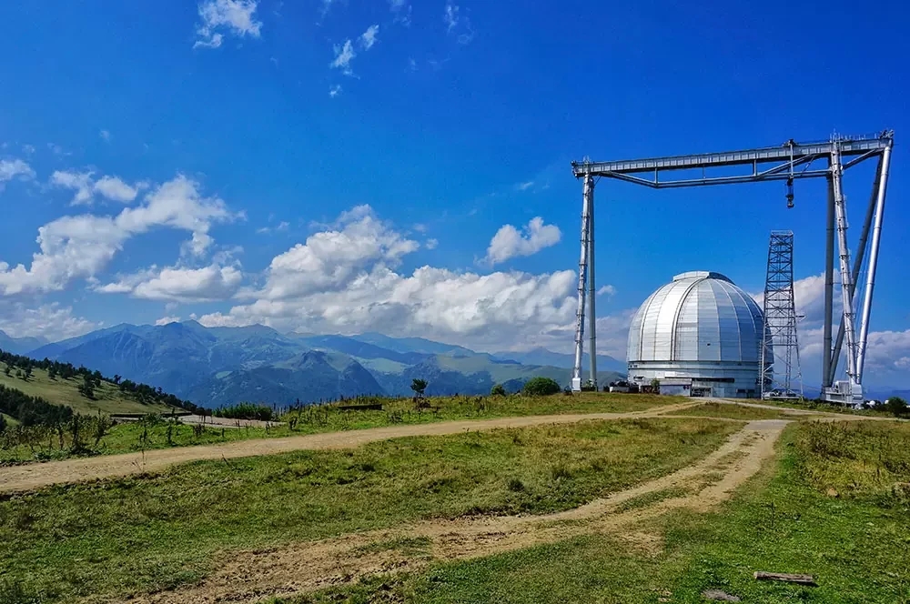 Специальная астрофизическая обсерватория РАН — один из главных научных центров астрономии в России, расположенный в горах Карачаево-Черкесии рядом с посёлком Нижний Архыз. Главная гордость обсерватории — Большой телескоп альт-азимутальный (БТА). Его зеркало диаметром 6 метров весит около 42 тонн, а сам купол возвышается более чем на 50 метров. Когда его запустили, это был крупнейший телескоп в мире, и до сих пор он остаётся одним из самых мощных инструментов для наблюдения за далёкими галактиками и звёздами. Телескоп расположен на высоте около 2070 метров, среди гор, где чистый воздух и минимальная засветка создают идеальные условия для наблюдений. Экскурсия в обсерваторию — это возможность буквально заглянуть внутрь научного процесса. Здесь можно увидеть гигантский купол изнутри, понять, как работает сложнейшая техника, и подняться на высоту, откуда открываются панорамы гор. Особенно сильное впечатление производят ночные экскурсии: при ясной погоде можно наблюдать звёзды и планеты через оборудование обсерватории. Что важно знать: Стоимость посещения — 500 рублей Дневные экскурсии проходят с 09:30 до 16:00 Ночные — по предварительной записи и зависят от погоды К обсерватории ведёт асфальтированная дорога с серпантином.