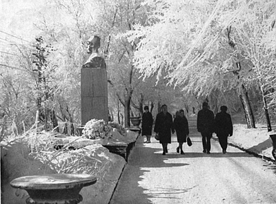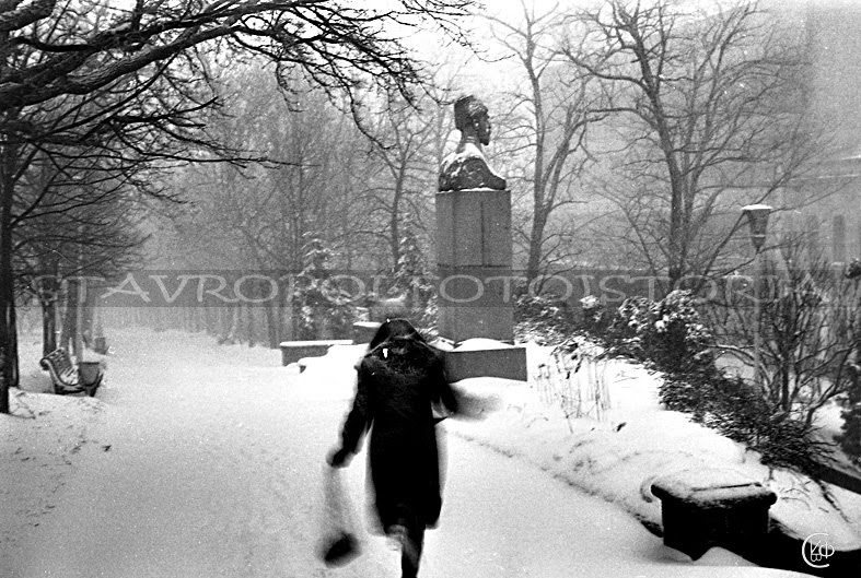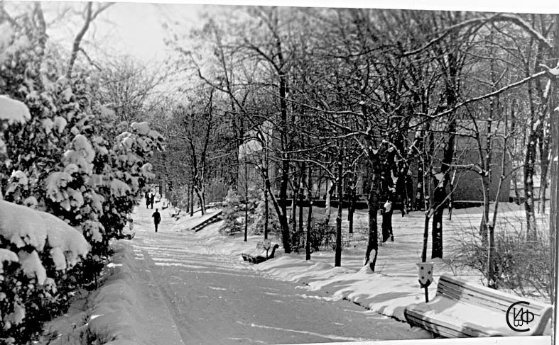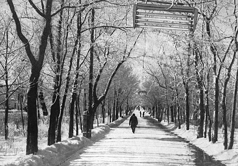 Прогулка по зимнему бульвару на проспекте Карла Маркса. Теперь он носит имя генерала Ермолова. На фото середина 1960-х и позднее. А на одном из снимков за деревьями прячется легендарная «Снежинка«, в народ – «сугроб».