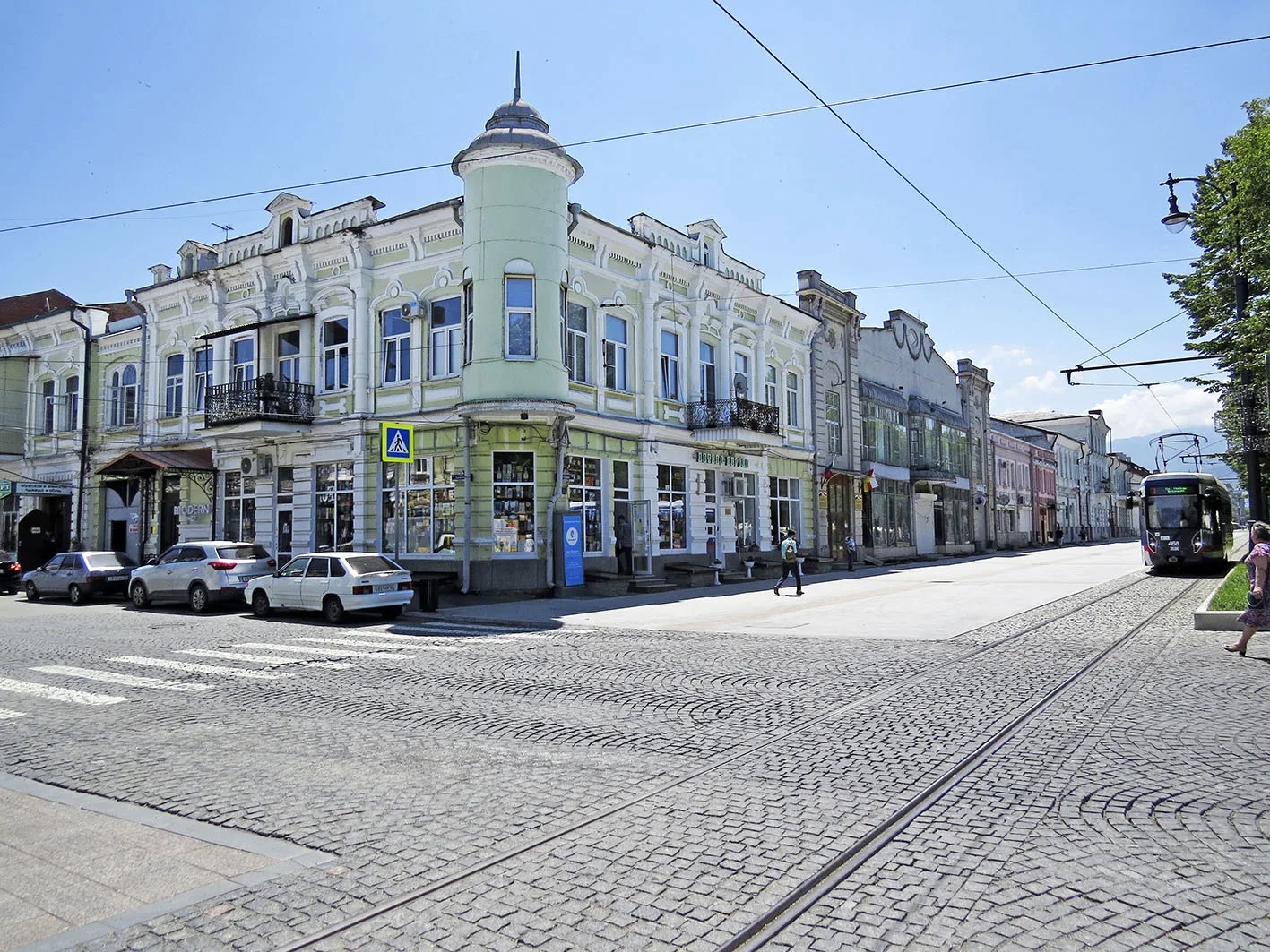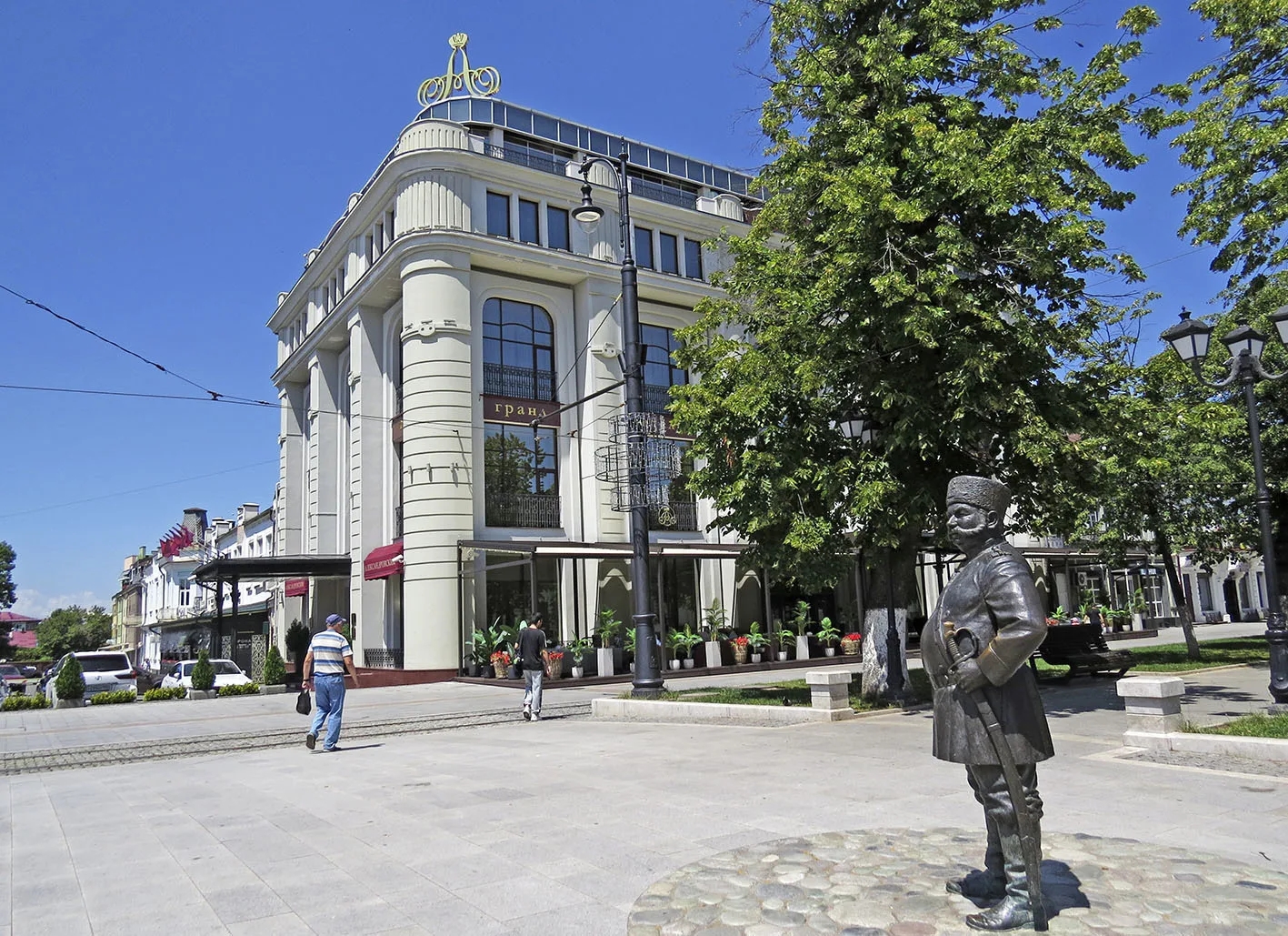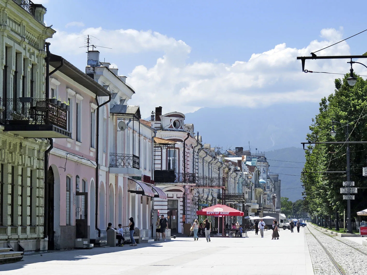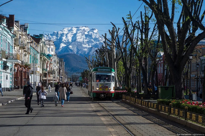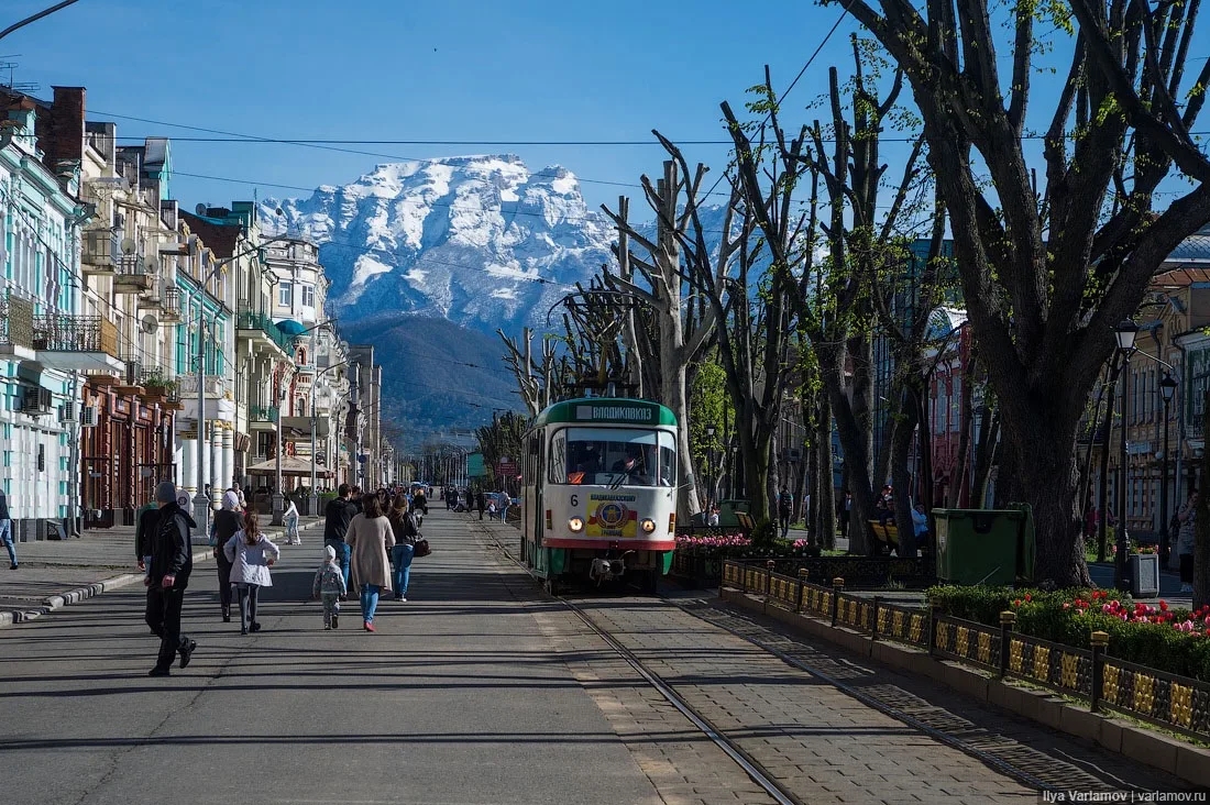 Но главное — это фон. Владикавказ стоит у подножия Кавказских гор, и если повезет с погодой, то в конце улицы можно увидеть снежные вершины. И в этот момент понимаешь: