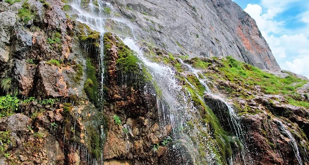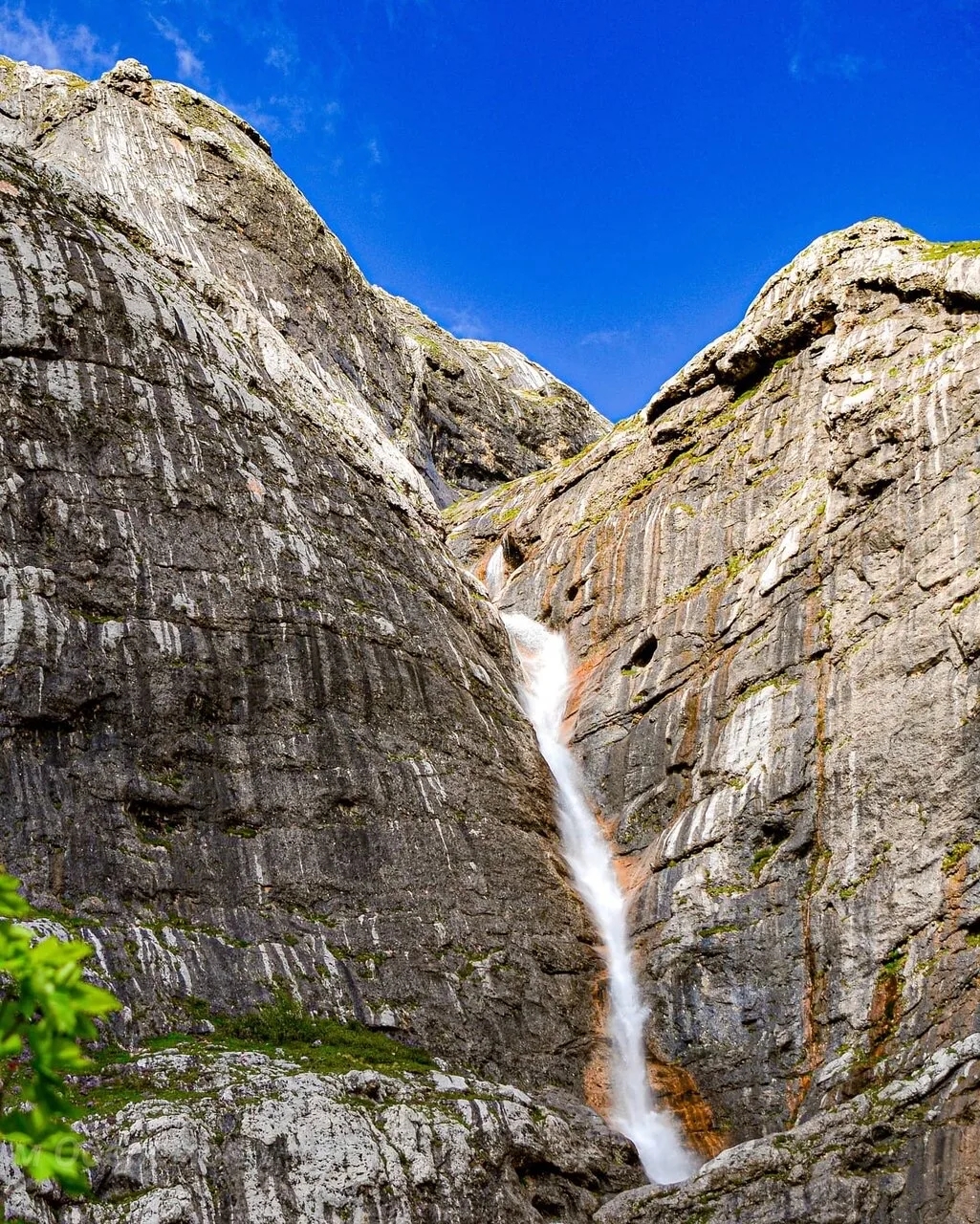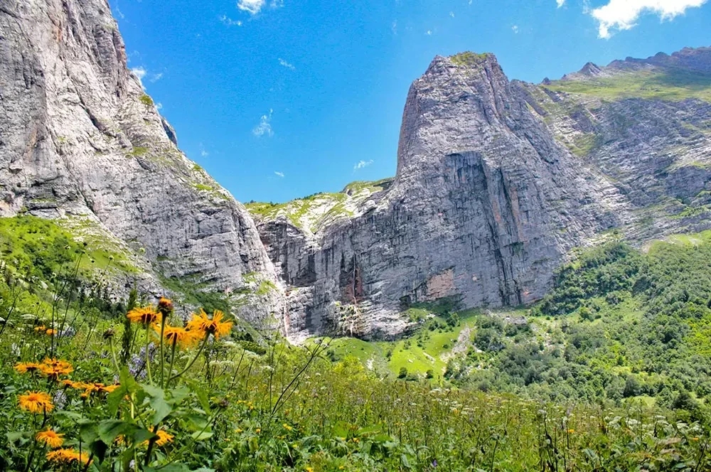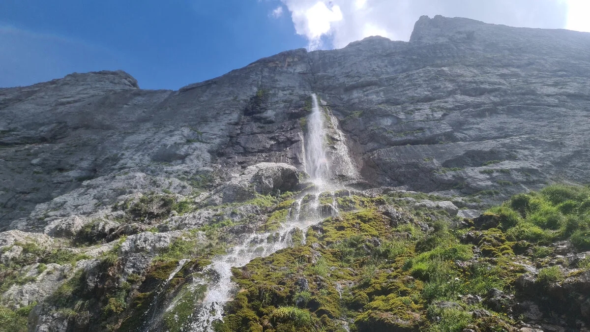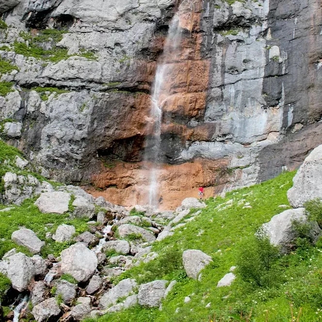 Он срывается с уступа между вершинами Фишт и Пшехо-Су, образуя двойной каскад, который видно за километры.
