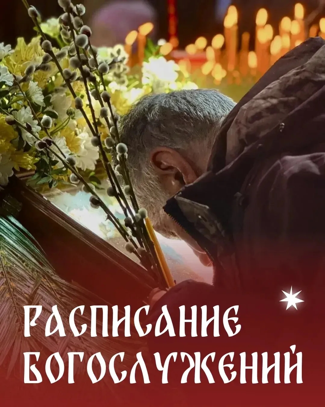 4 апреля, суббота: Лазарева Суббота 08:00 — Божественная Литургия, исповедь; 16:00 — вечернее Богослужение, освящение вербы, общая исповедь; 5 апреля, воскресенье: Вербное Воскресенье 08:30 — Божественная Литургия.