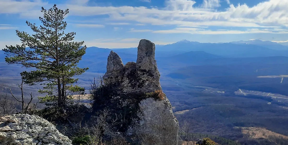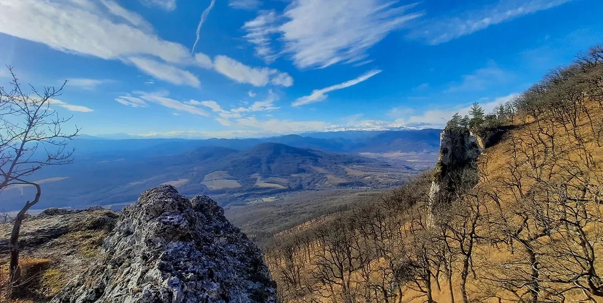 Со скалы открываются панорамы на плато Лаго-Наки, горы Фишт и Оштен, вершины Передового хребта, а внизу хорошо видна станица Даховская и долина реки Белой.