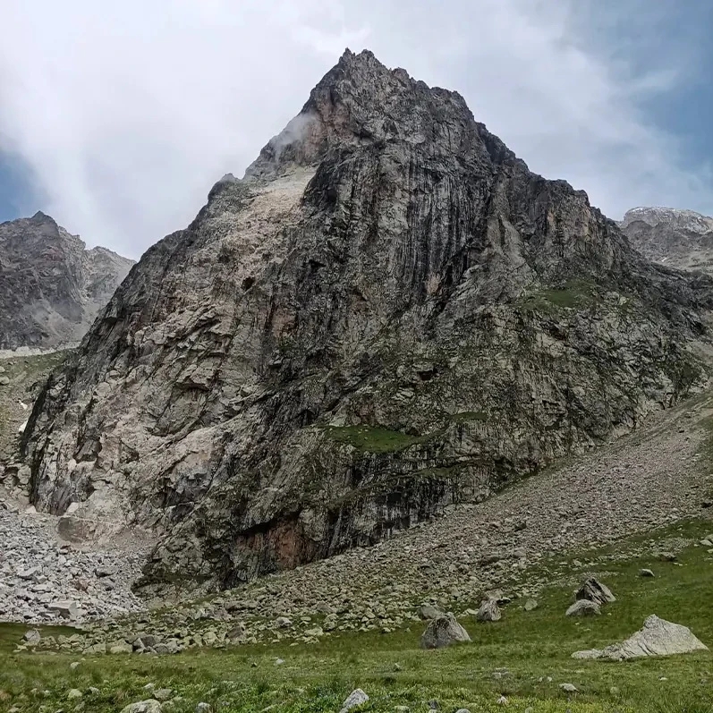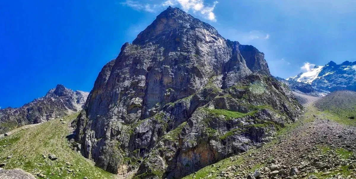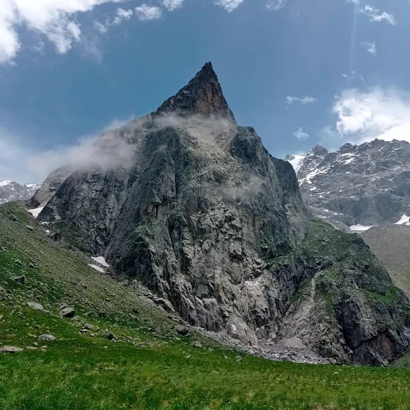 Скала Шлем — одна из самых узнаваемых вершин Безенги, региона с самыми высокими горами Кавказа. Она поднимается на 3486 метров и сразу выделяется строгой формой: тёмная, острая, почти без растительности.