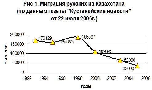 По состоянию на 1 января 2006 года численность казахов составила 8913,3 тыс. человек, русских - 3979,3 тыс., украинцев - 229,6 тыс., немцев - 222,7 тыс., человек. В сравнении с состоянием на 1 января 2005 года численность казахов увеличилась на 2,2%. Наблюдалось снижение численности русских на 1,1 %, украинцев - на 4,2%, немцев - на 2,4%. Таким образом «русская общность» Казахстана не дотягивает сейчас и до трети населения республики. Численность казахов увеличилась как за счет естественного прироста, так и положительного сальдо миграции за счет оралманов.