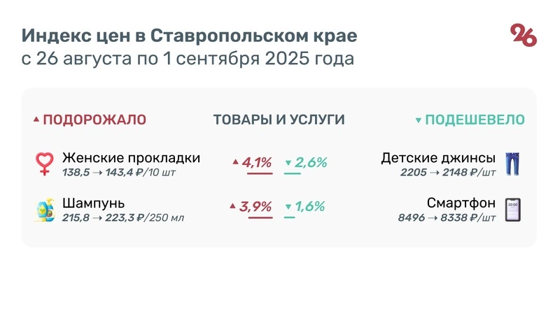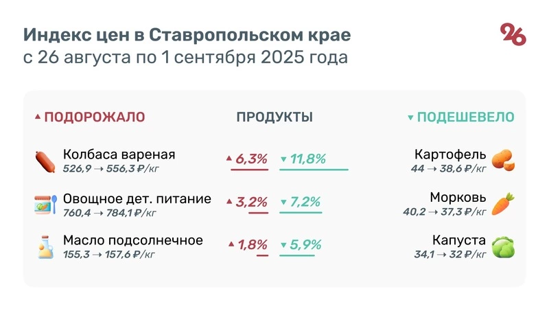 По данным Северо-Кавказстата, с 26 августа по 1 сентября подорожали варёная колбаса — с 526,9 до 556,3 р/кг (+6,3%), овощное детское питание — с 760,4 до 784,1 р/кг (+3,2%) и подсолнечное масло — с 155,3 до 157,6 р/кг (+1,8%).Фото: Антон Глушков / ИА «Победа26»При этом подешевели картофель — с 44 до 38,6 р/кг (−11,8%), морковь — с 40,2 до 37,3 р/кг (−7,2%) и капуста — с 34,1 до 32 р/кг (−5,9%).Фото: Антон Глушков / ИА «Победа26»Среди прочих товаров подорожали женские прокладки — с 138,5 до 143,4 р/10 шт (+4,1%) и шампунь — с 215,8 до 223,3 р/250 мл (+3,9%). Подешевели детские джинсы — с 2205 до 2148 р/шт (−2,6%) и смартфоны — с 8496 до 8338 р/шт (−1,6%). Ранее сообщалось, что производство огурцов в теплицах Ставрополья выросло в полтора раза. Особое внимание развитию сельского хозяйства уделяет губернатор Владимир Владимиров. | |