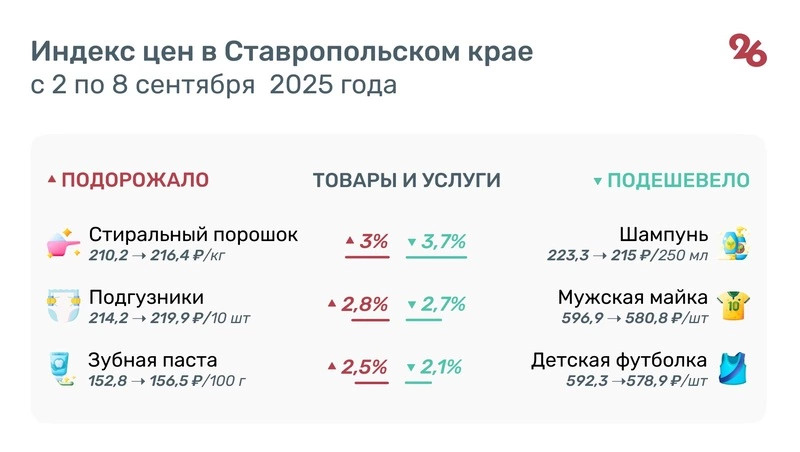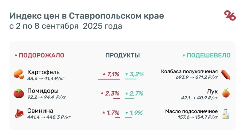 За неделю в Ставропольском крае подорожали картофель с 38,6 до 41,4 р/кг (+7,1%), помидоры с 92,2 до 94,4 р/кг (+2,3%) и свинина с 441,4 до 448,3 р/кг (+1,7%). При этом подешевели полукопчёная колбаса с 693,9 до 671,2 р/кг (−3,2%), лук с 42,1 до 40,9 р/кг (−2,7%) и подсолнечное масло с 157,6 до 154,7 р/кг (−1,9%).Фото: ИА «Победа26»Среди непродовольственных товаров подорожали стиральный порошок с 210,2 до 216,4 р/кг (+3%), подгузники с 214,2 до 219,9 р/10 шт (+2,8%) и зубная паста с 152,8 до 156,5 р/100 г (+2,5%).Фото: ИА «Победа26»Цены снизились на шампунь с 223,3 до 215 р/250 мл (−3,7%), мужские майки с 596,9 до 580,8 р/шт (−2,7%) и детские футболки с 592,3 до 578,9 р/шт (−2,1%). Ранее сообщалось, что средняя цена картофеля на Ставрополье снизилась. | |
