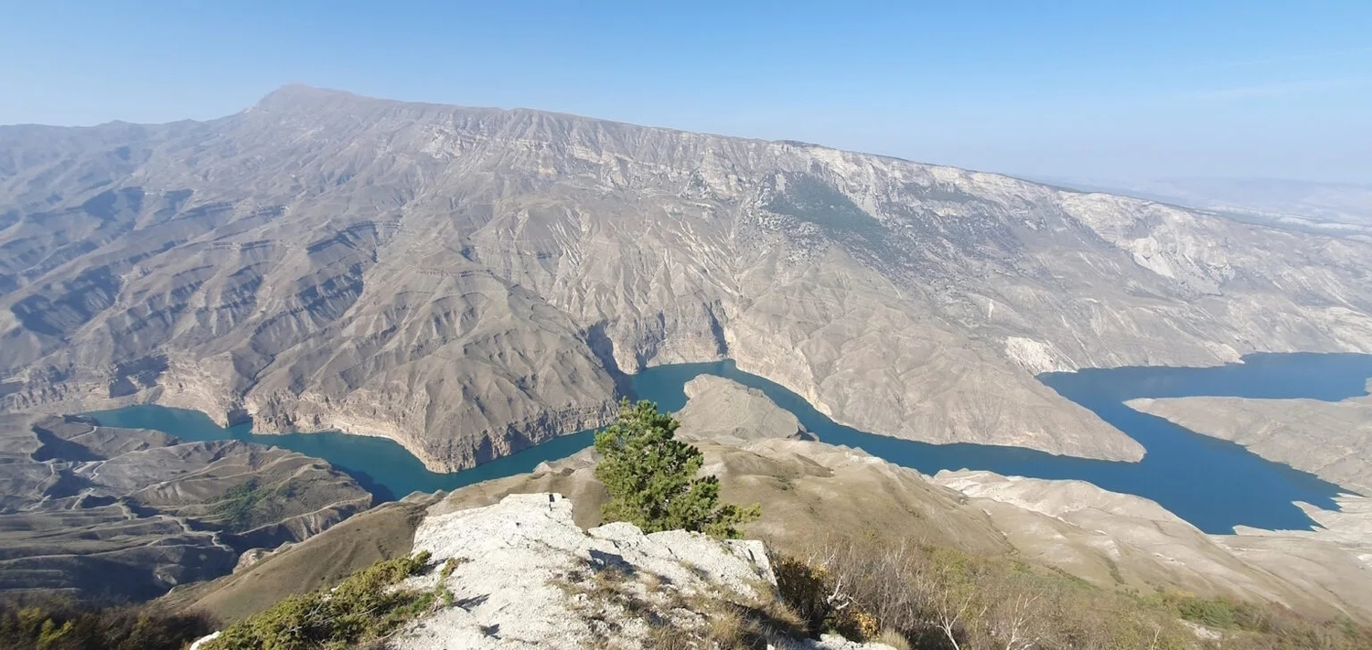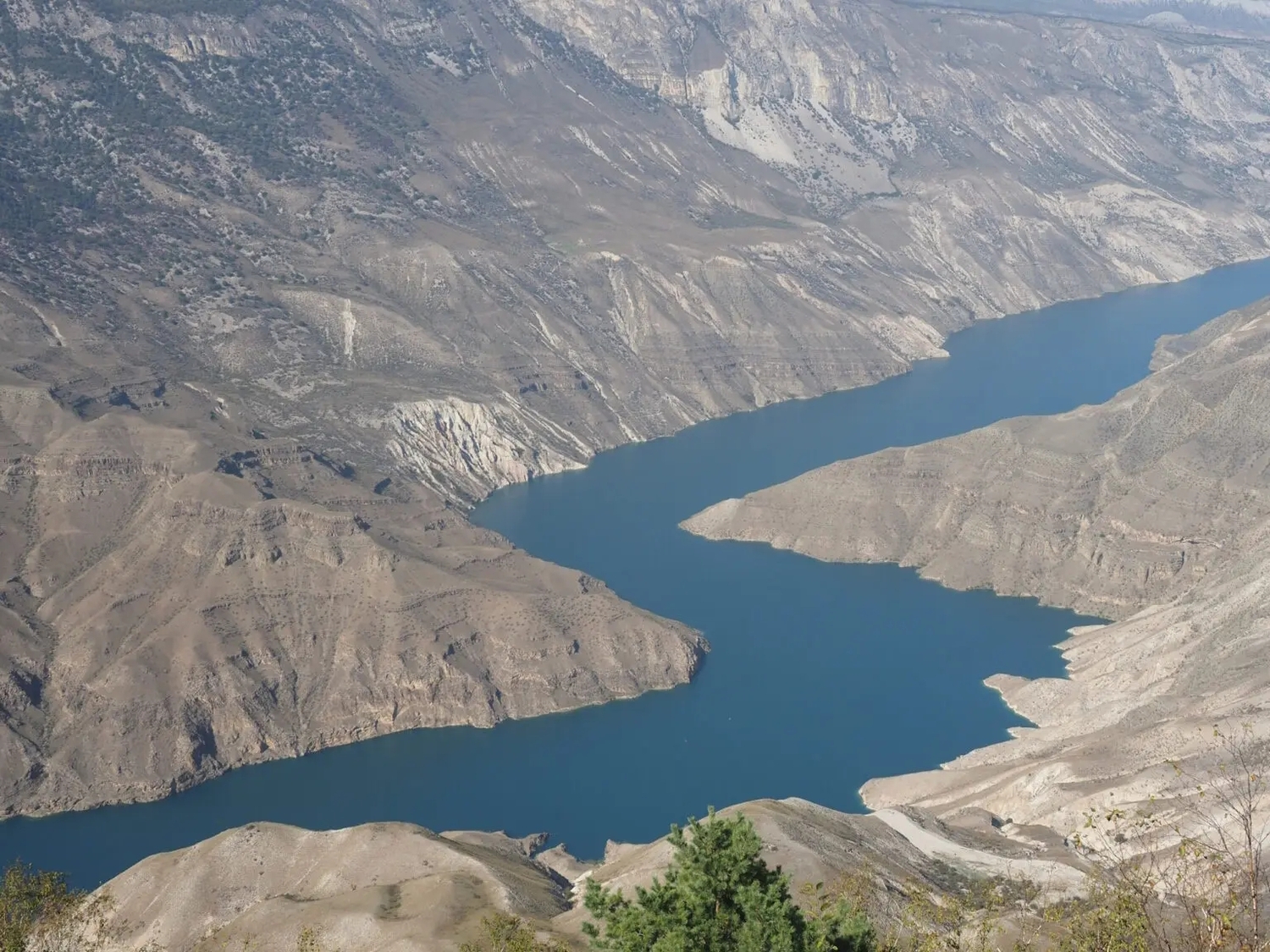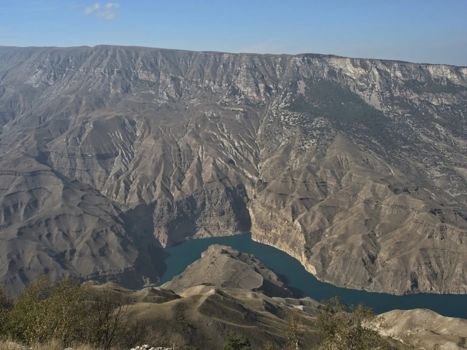 С площадки видно огромный участок Сулака на десятки километров вперед. В одну сторону каньон уходит к началу, в другую — к Чиркейскому водохранилищу. Панорама настолько широкая, что глаз не сразу понимает масштаб.