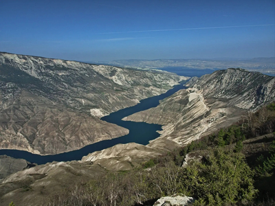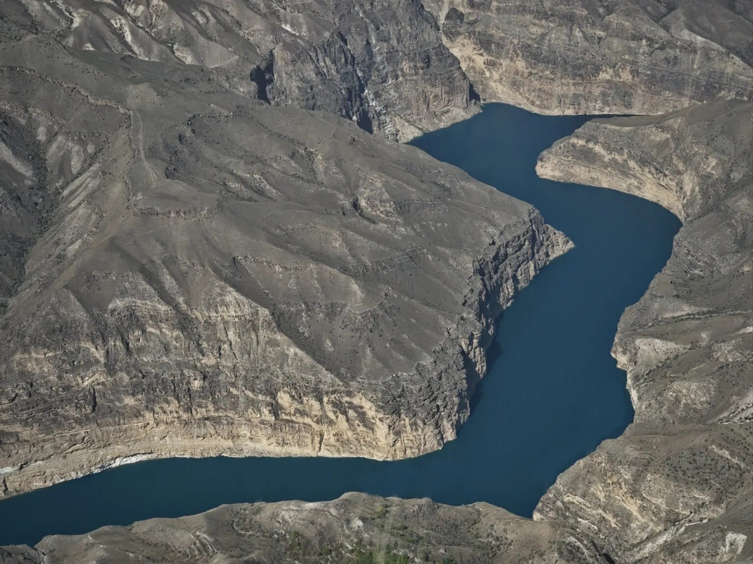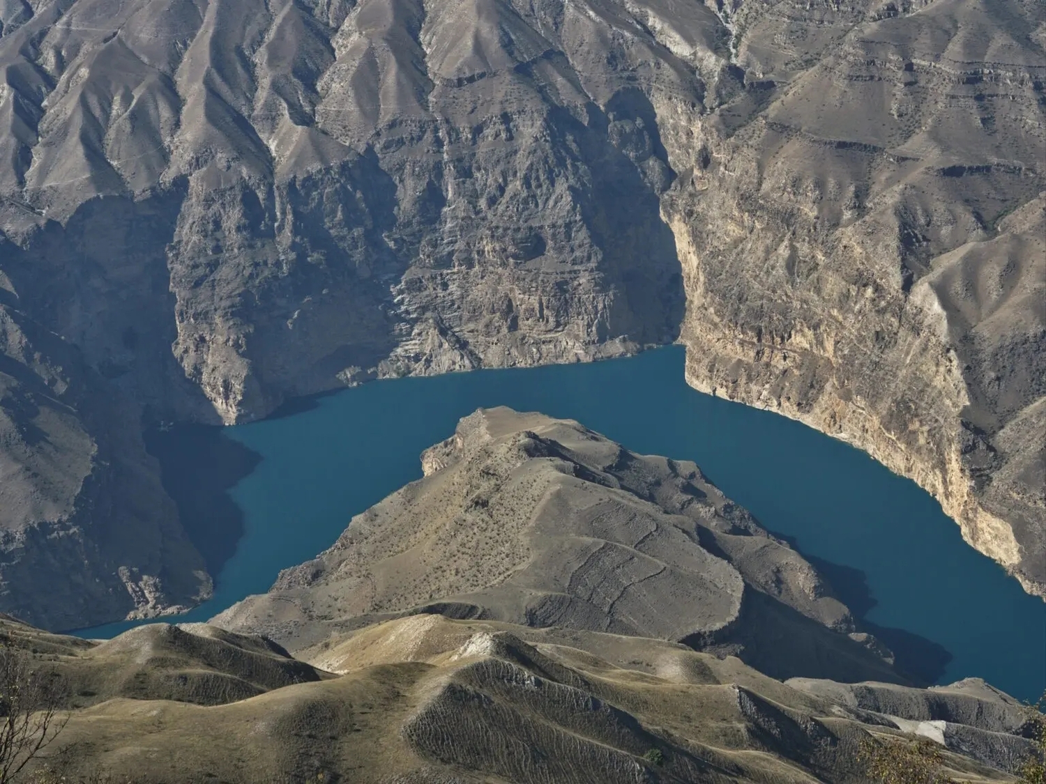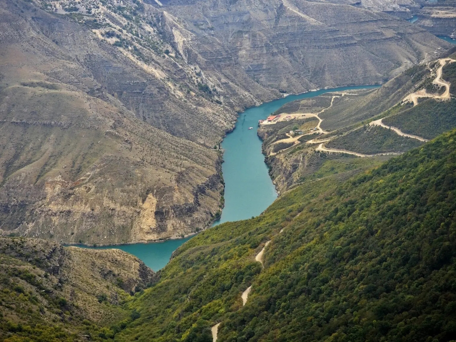 С площадки видно огромный участок Сулака на десятки километров вперед. В одну сторону каньон уходит к началу, в другую — к Чиркейскому водохранилищу. Панорама настолько широкая, что глаз не сразу понимает масштаб.