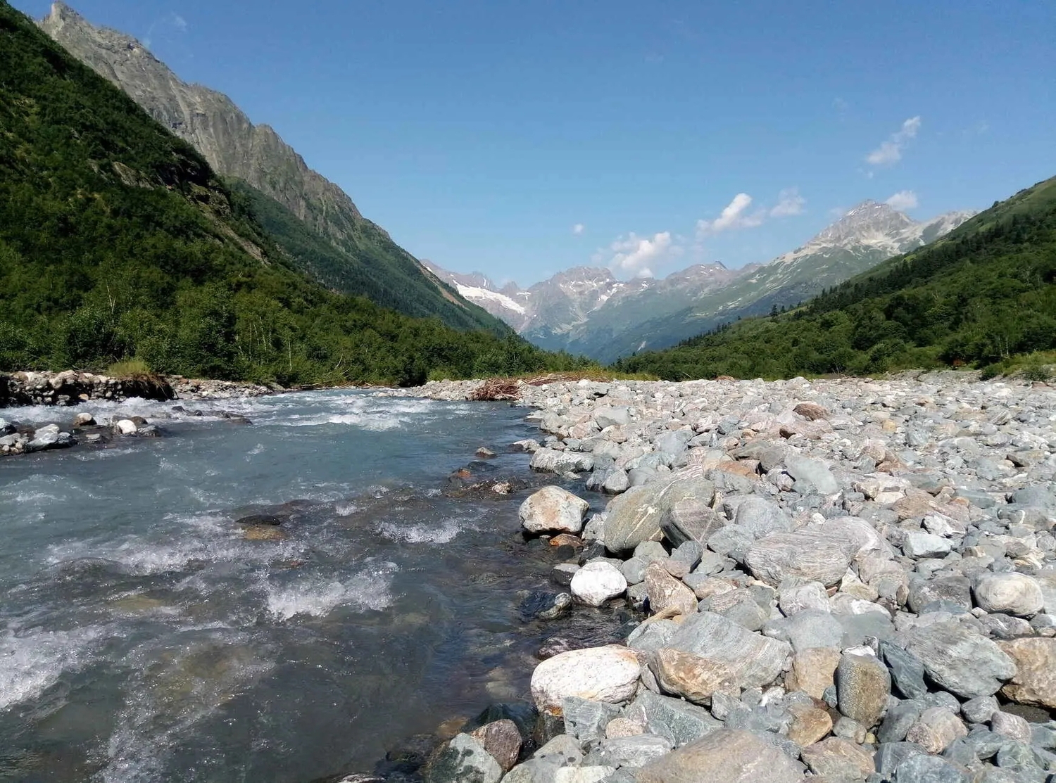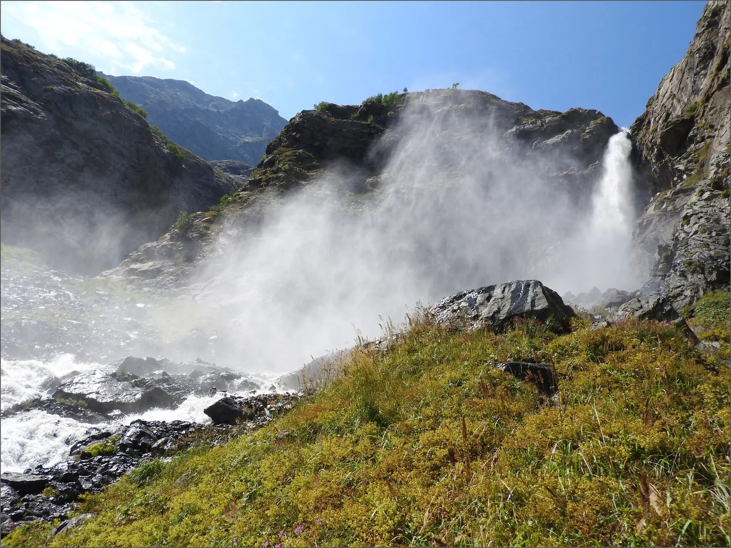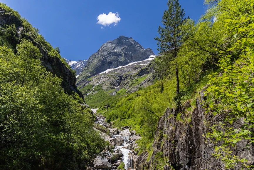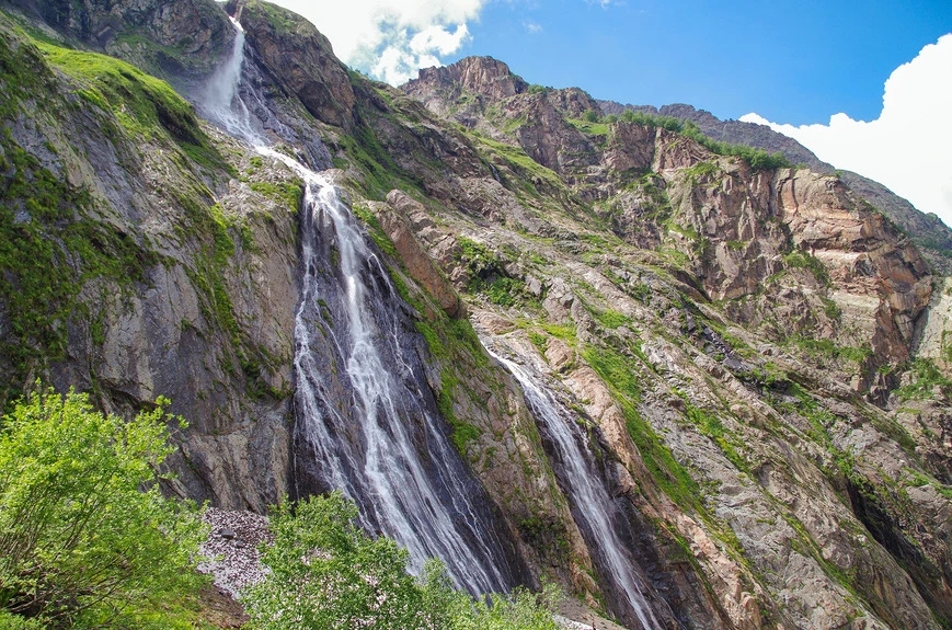 Один из самых атмосферных маршрутов Домбая, где горы, ледники и водопады делают это место особенным. Не случайно его название переводится как «злая пасть» — именно здесь формируется погода, собираются облака и рождаются резкие горные ветры. Над ущельем возвышается легендарная вершина Суфруджу, состоящая из двух пиков. Северный достигает 3871 метра, а Южный, известный как «Зуб Суфруджу», выглядит как острый клык, пронзающий небо. По местным легендам, здесь обитает дух гор, и если вершины окутаны облаками — жди перемены погоды. Маршрут к водопадам начинается с окраины Домбая и постепенно уводит вдоль бурной реки Аманауз через хвойный лес. По пути встречается Чертова мельница — мощный водоворот, скрытый в каньоне. Далее тропа выводит к альпийским лугам, где открываются панорамы на Суфруджу и соседние вершины. Первый каскад появляется неожиданно, но он лишь предвестник. Настоящее впечатление производит второй водопад высотой до 100 метров — мощный поток, разбивающийся о скалы и создающий облако брызг. В солнечную погоду здесь часто возникает радуга. Немногие доходят дальше, за вторым водопадом скрывается третий каскад, добраться к которому можно только при низком уровне воды, обычно в начале осени. Что важно знать: Ущелье находится в пограничной зоне, необходим паспорт. Вход осуществляется через территорию Тебердинского заповедника, где оформляется разрешение. Стоимость: 200 рублей Сезон: июнь — ноябрь (часто открывают позже из-за лавин) Маршрут: 6,4 км Время: 6–7 часов Перепад высот: 1600–2100 м