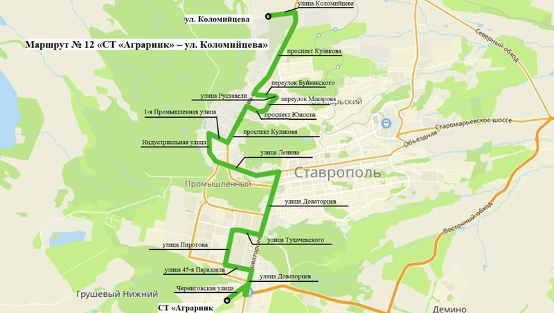 Автобусы маршрута № 5 будут возить пассажиров от проезда Кожевенного до улицы Герцена, по маршруту № 12 можно будет проехать от садового товарищества «Аграрник» до улицы Коломийцева. На маршруте № 5 будут работать 12 автобусов малого класса. Интервал движения в рабочие дни составить 13-20 минут, в выходные и праздники — 30-49 минут.Маршрут автобуса №5Фото: Миндор Ставропольского краяНа маршрут № 12, по планам, выйдут десять автобусов малого класса с интервалом 15-20 минут по будням и 20-35 минут — в нерабочие дни. На обоих маршрутах проезд можно будет оплачивать безналичным способом.
