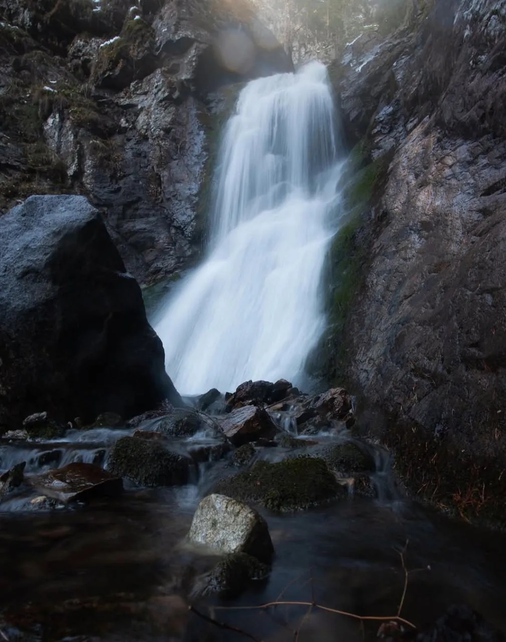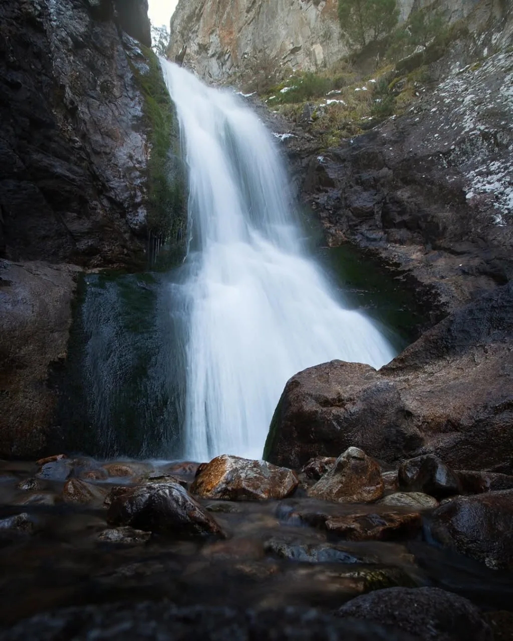 Он небольшой, всего около 5 метров, но его поток очень мощный, гулкий, разбивается на каскады и создает плотный шум, который слышно еще задолго до самого водопада. Маршрут короткий и один из самых доступных в Домбае. Тропа ведет через густой пихтовый лес: мох, камни, запах хвои и ощущение, будто зашел в другую реальность. По пути встречается мост через реку, потом небольшой подъем, лестница, и только тогда водопад открывается полностью. До этого его не видно, только слышно. Зимой Шумка меняется: часть потоков замерзает, шум почти исчезает, и вместо грохота тишина и ледяные формы. Что важно знать: Формат: пеший маршрут Дистанция: 1,3 км Время: 1–1,5 часа Перепад высот: 1390–1540 м Стоимость: 200 рублей (заповедник) Сезон: круглый год