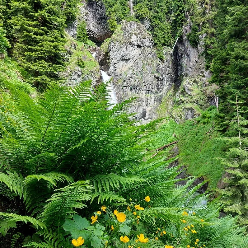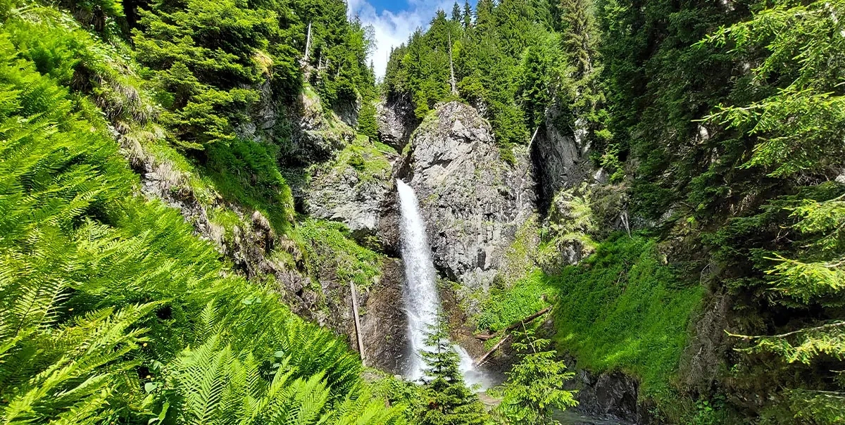 Он спрятан в глубине леса, в долине реки Большая Лаба. Дорога сюда идет через густой хвойный лес, папоротники и камни под шум реки, который постепенно превращается в грохот.