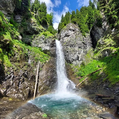 Сам водопад зажат между скалами, покрытыми мхом. Поток узкий, но очень мощный — летом особенно бурный и резкий. У подножия небольшое озеро.