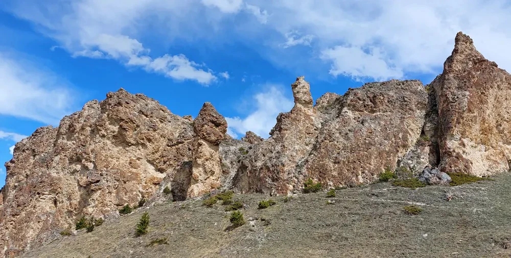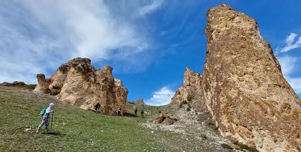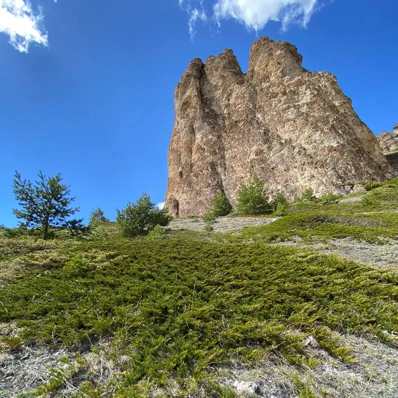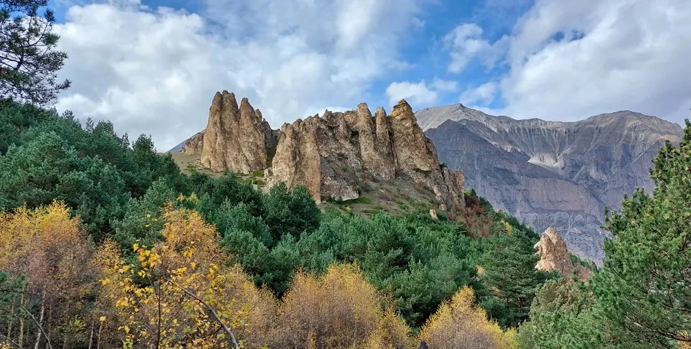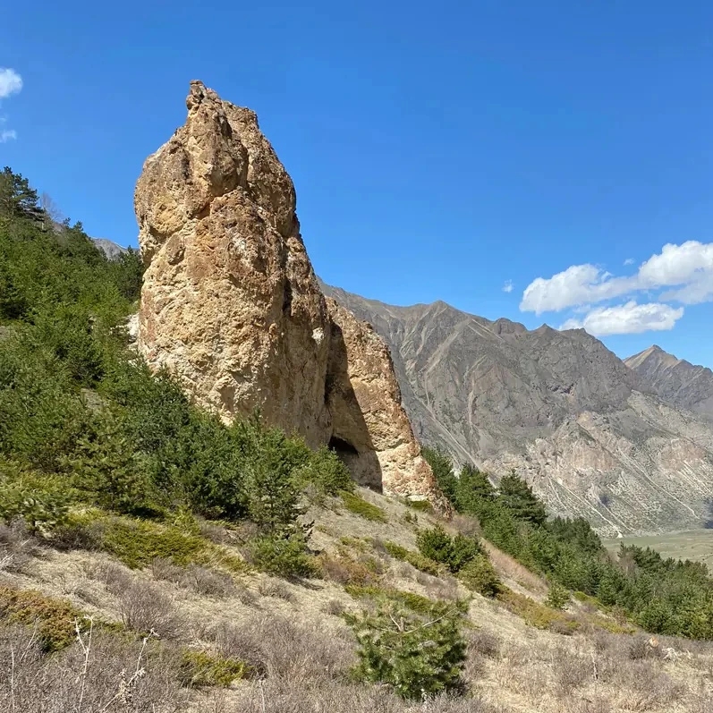 На самом деле это останцы — скалы, которые веками вытачивал ветер. И выглядят они так, словно кто-то специально построил здесь целый ряд башен и крепостей. Золотыми их называют не случайно. При солнечном свете скалы действительно отдают теплым, почти медным оттенком. А в тумане все меняется: силуэты размываются, формы становятся странными и живыми, и кажется, будто эти «замки» вот-вот начнут двигаться. Всего таких природных фигур здесь несколько десятков. У некоторых есть небольшие гроты и пещеры, куда можно заглянуть. Чем выше поднимаешься, тем шире открываются виды на Чегемское ущелье, снежные вершины и маленькие дома Булунгу внизу. Путь к останцам идет сначала через лес, затем по открытым склонам, далее участок без явной тропы, где приходится ориентироваться по рельефу. По дороге встречается еще одна необычная точка — скала-гриб. Что важно знать: Расстояние трекинга 14,5 км Время в пути: 6–7 часов Перепад высот: 1620–2150 м Стоимость: бесплатно Сезон: круглый год